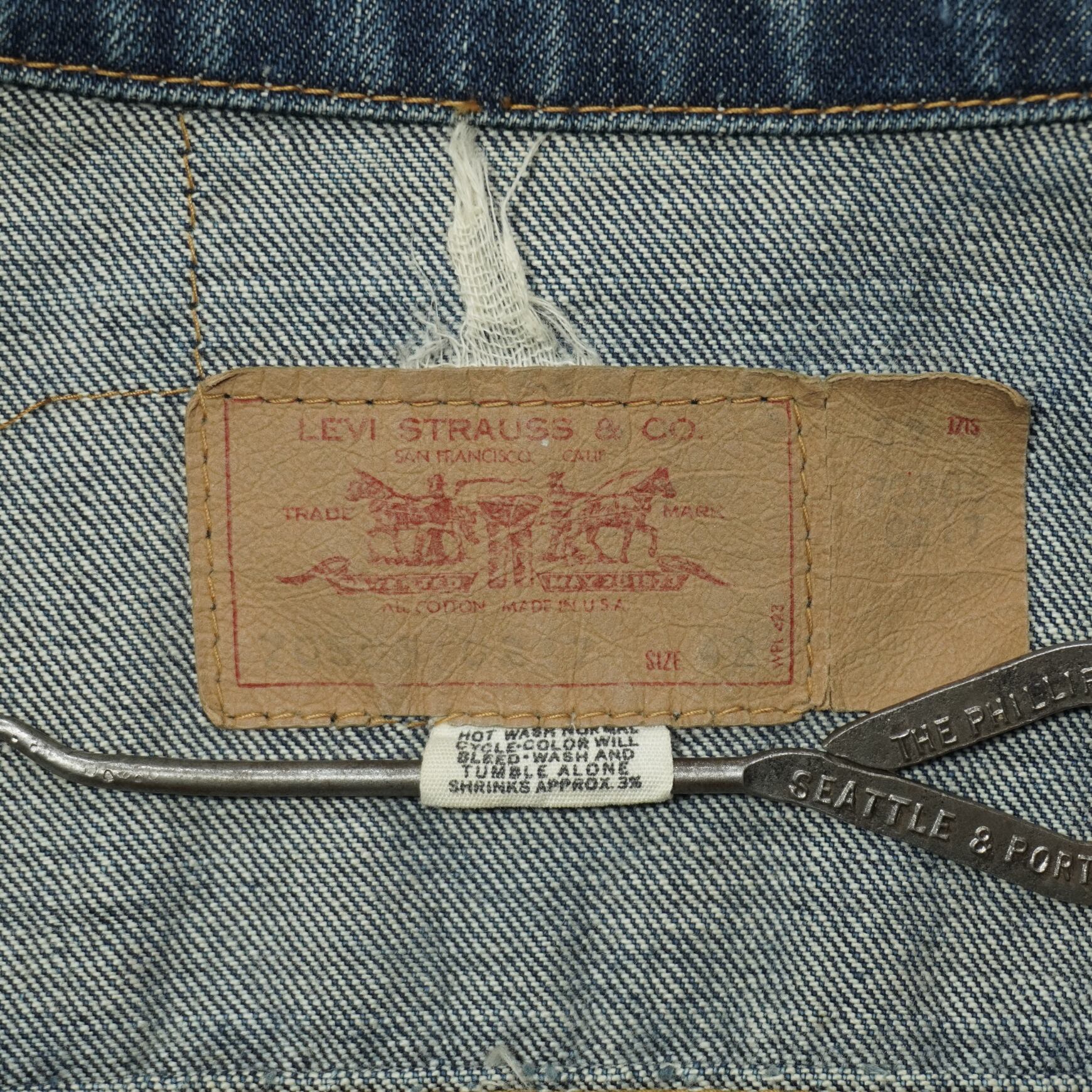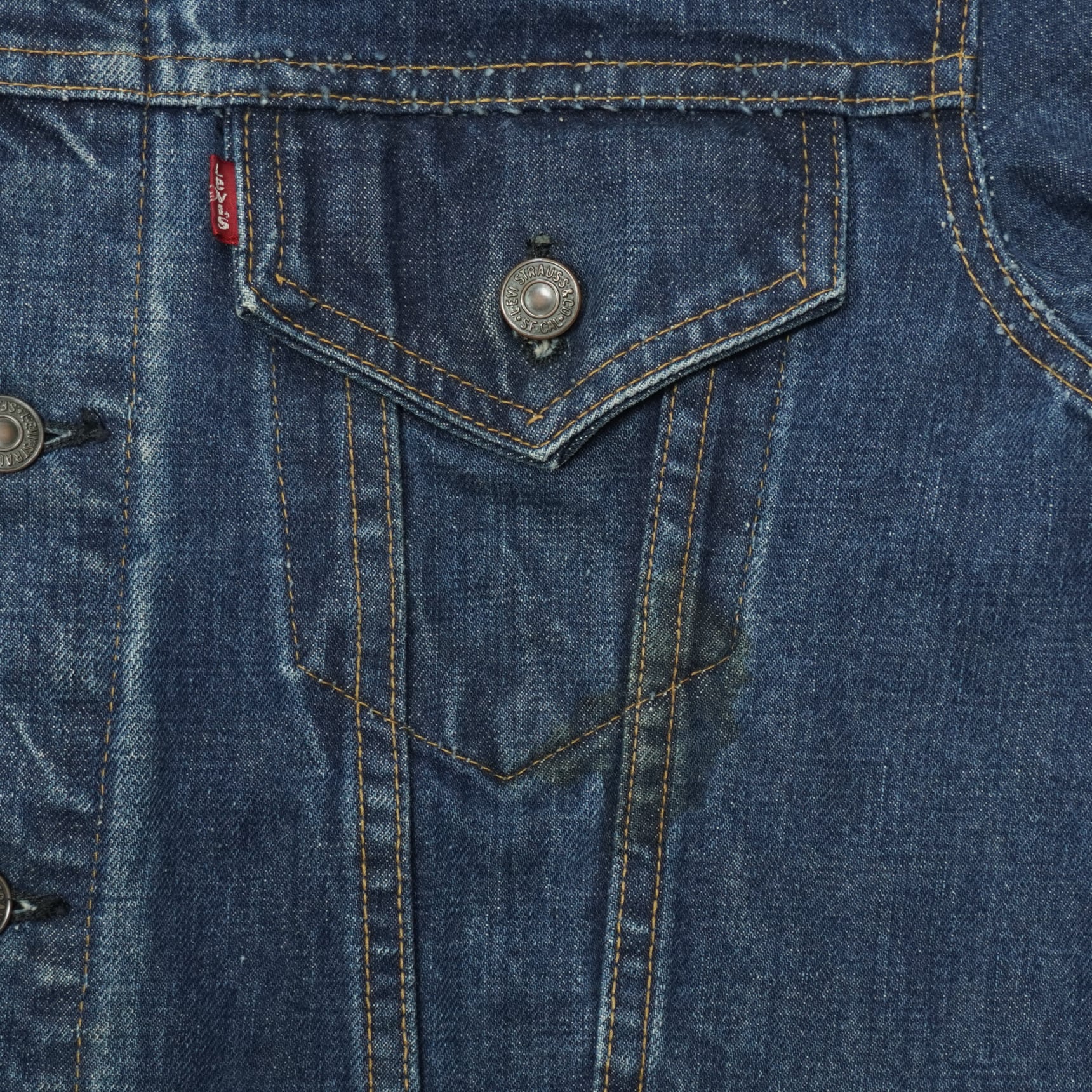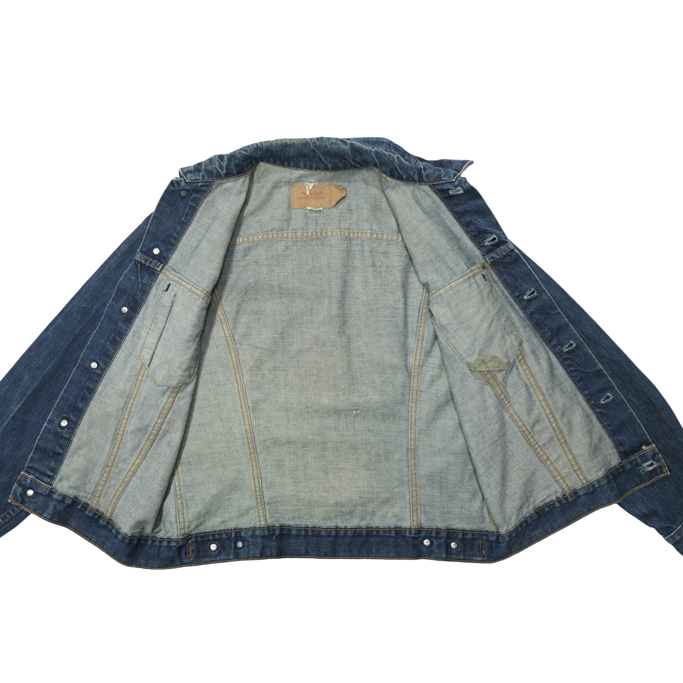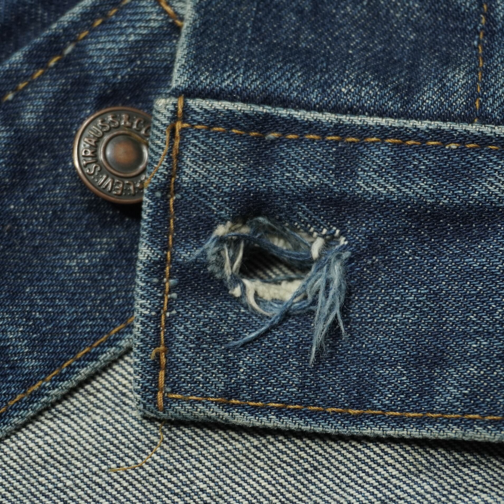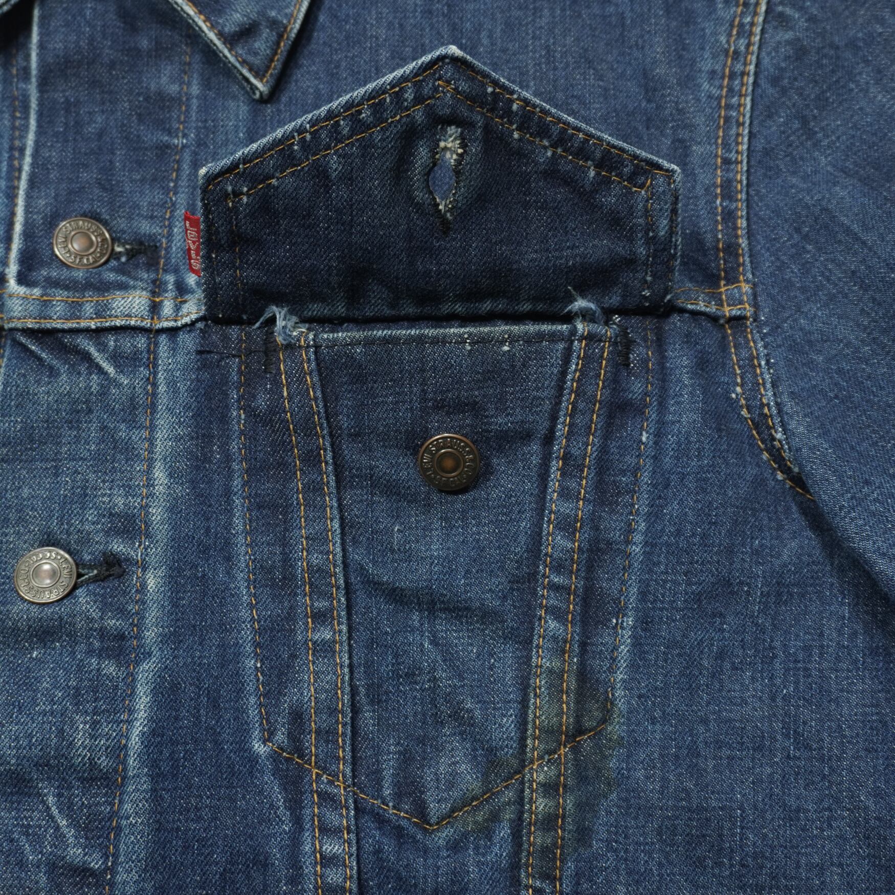 紙パッチの上部にサイズ表記タグの残骸が残っているので数回ウォッシュ程度の濃紺のインディゴです。
