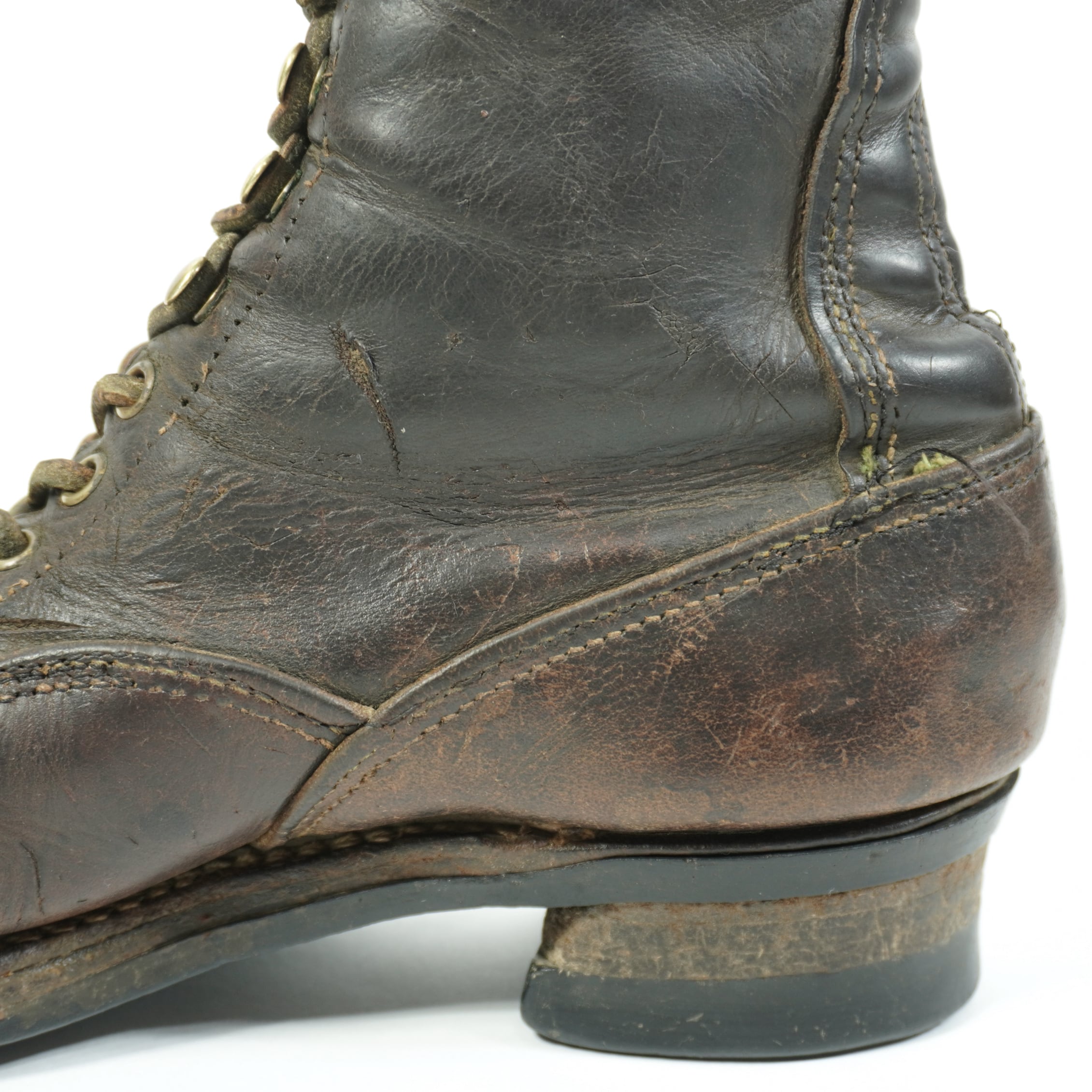履き込まれていて、擦れやキズや汚れ、リペア、ステッチほつれや縫い直し、ハトメに青錆、ソールに減り、トップリフトの積み上げにダメージがあります。