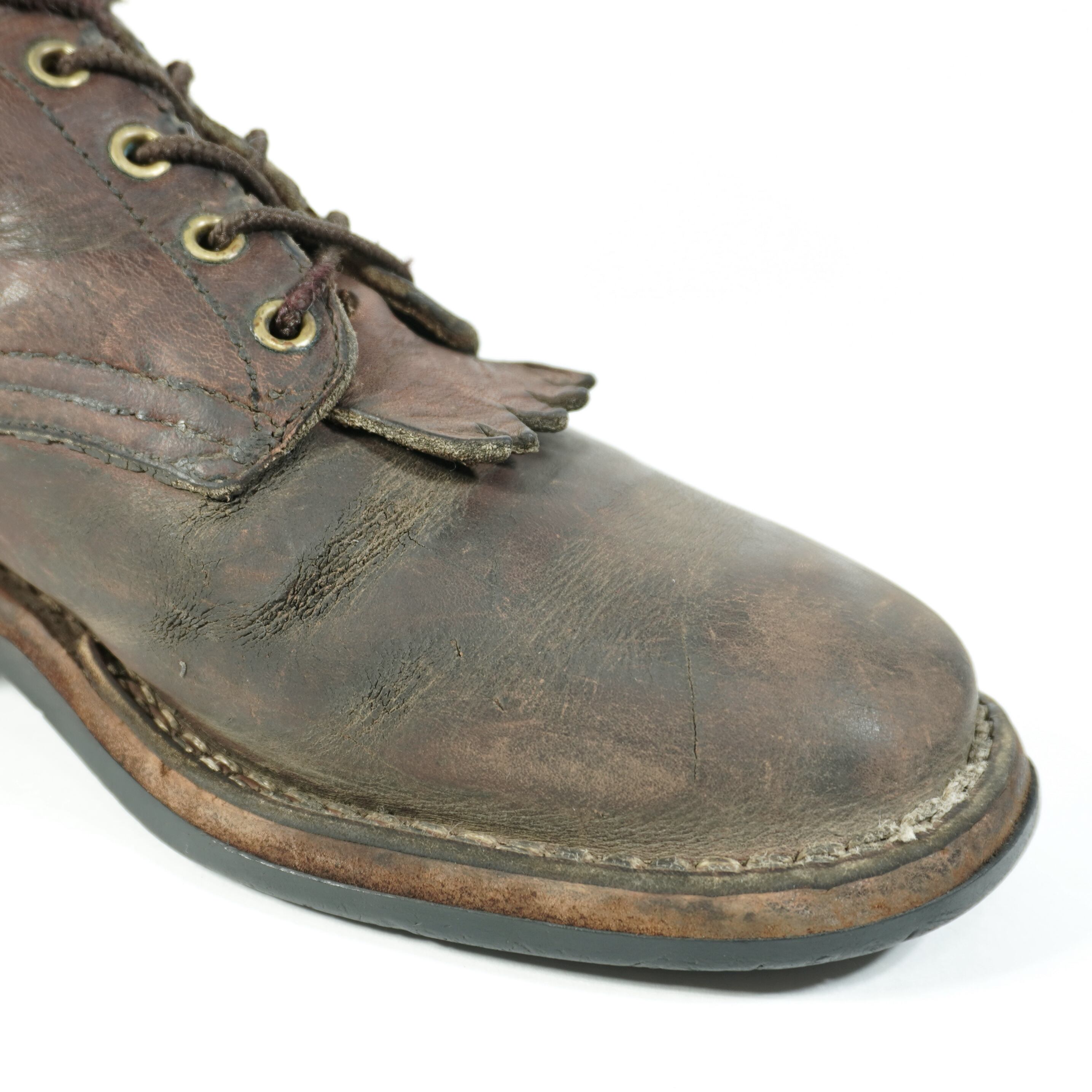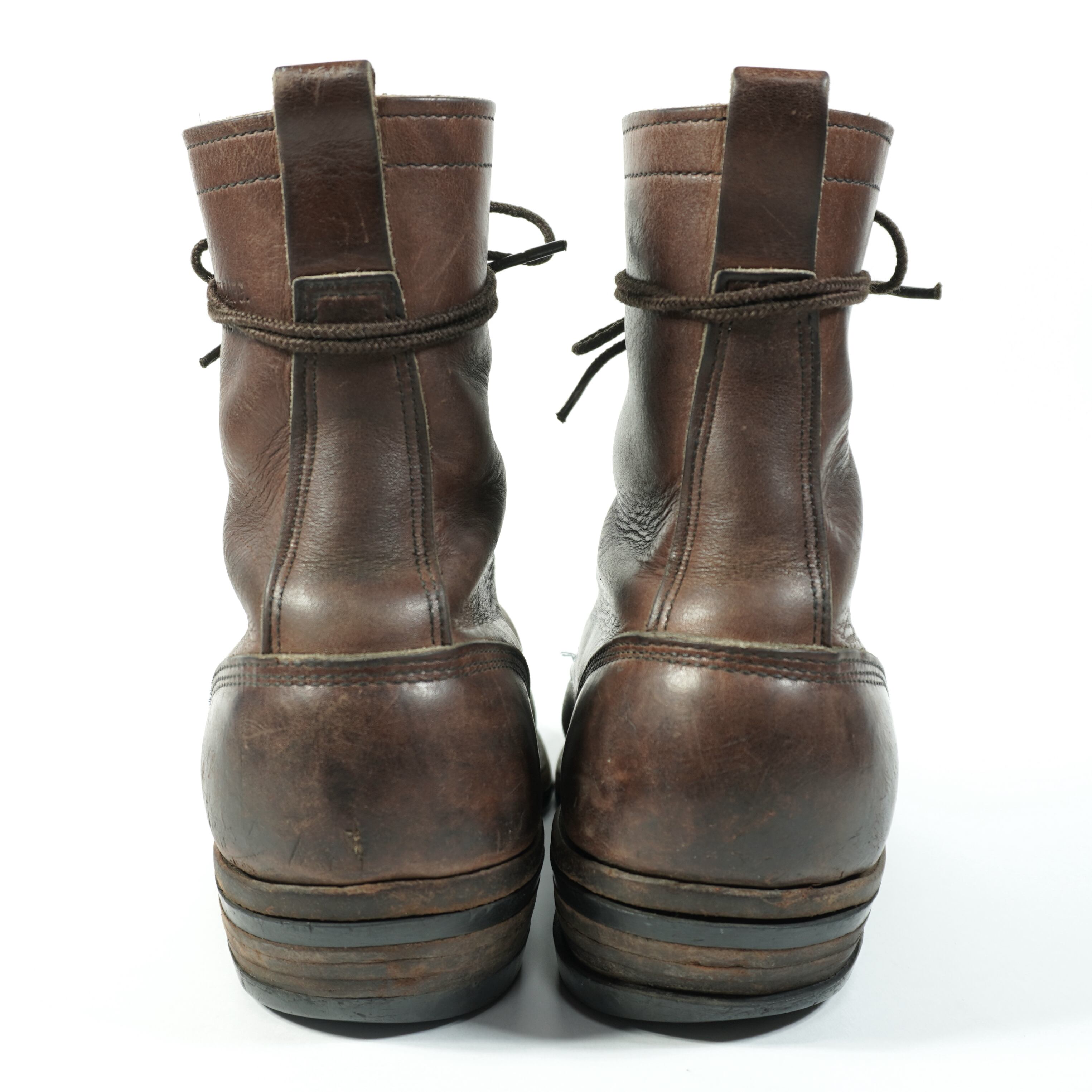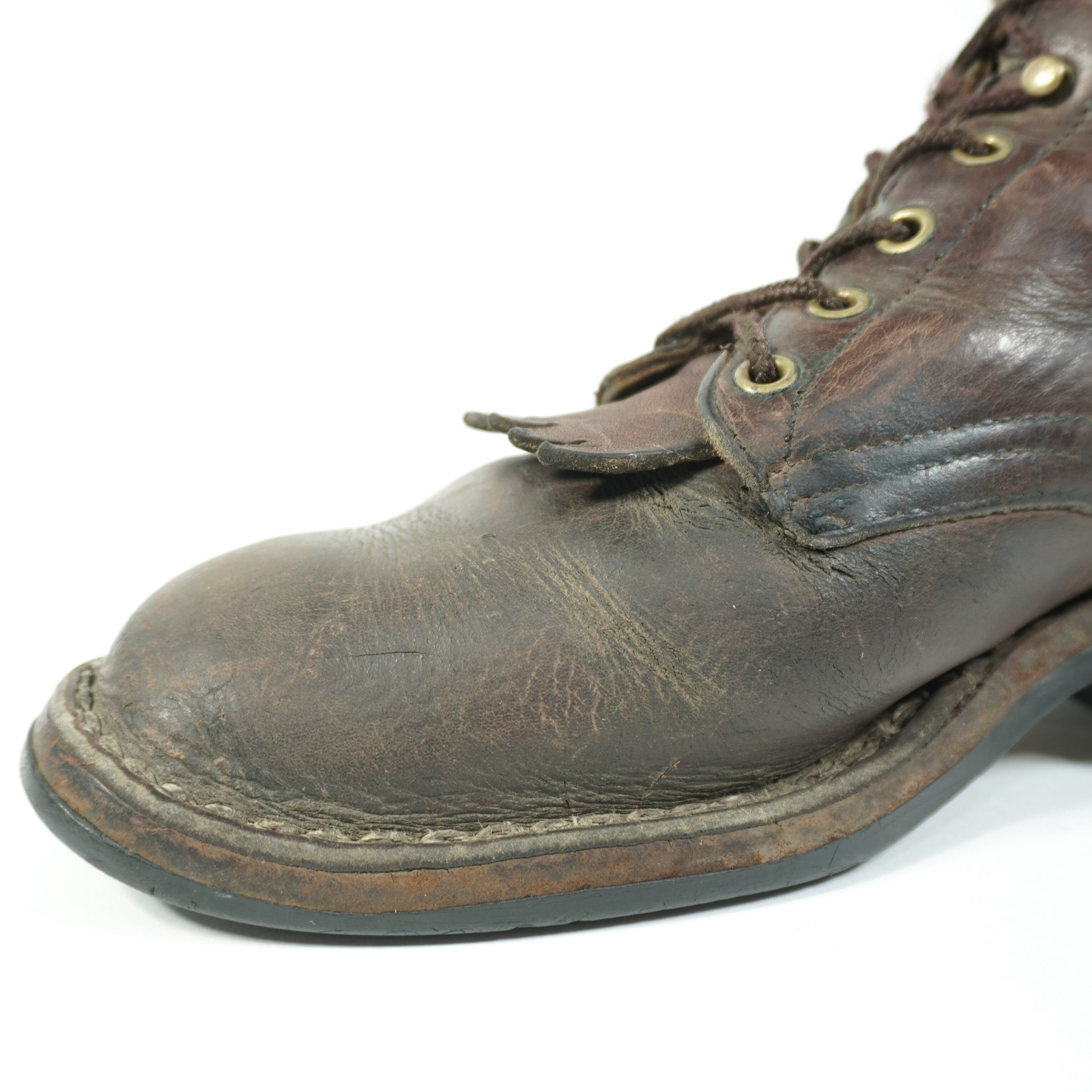 履き込まれていて、擦れやキズ、右足のタンが破れたのをリペア、ハトメに青錆、ソールに減りがあります。