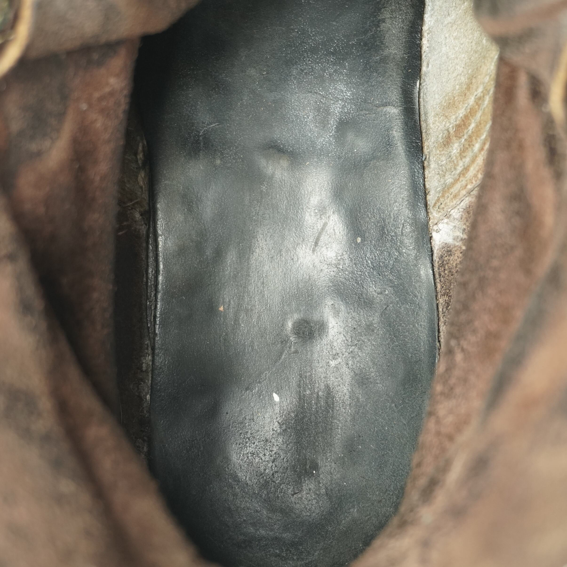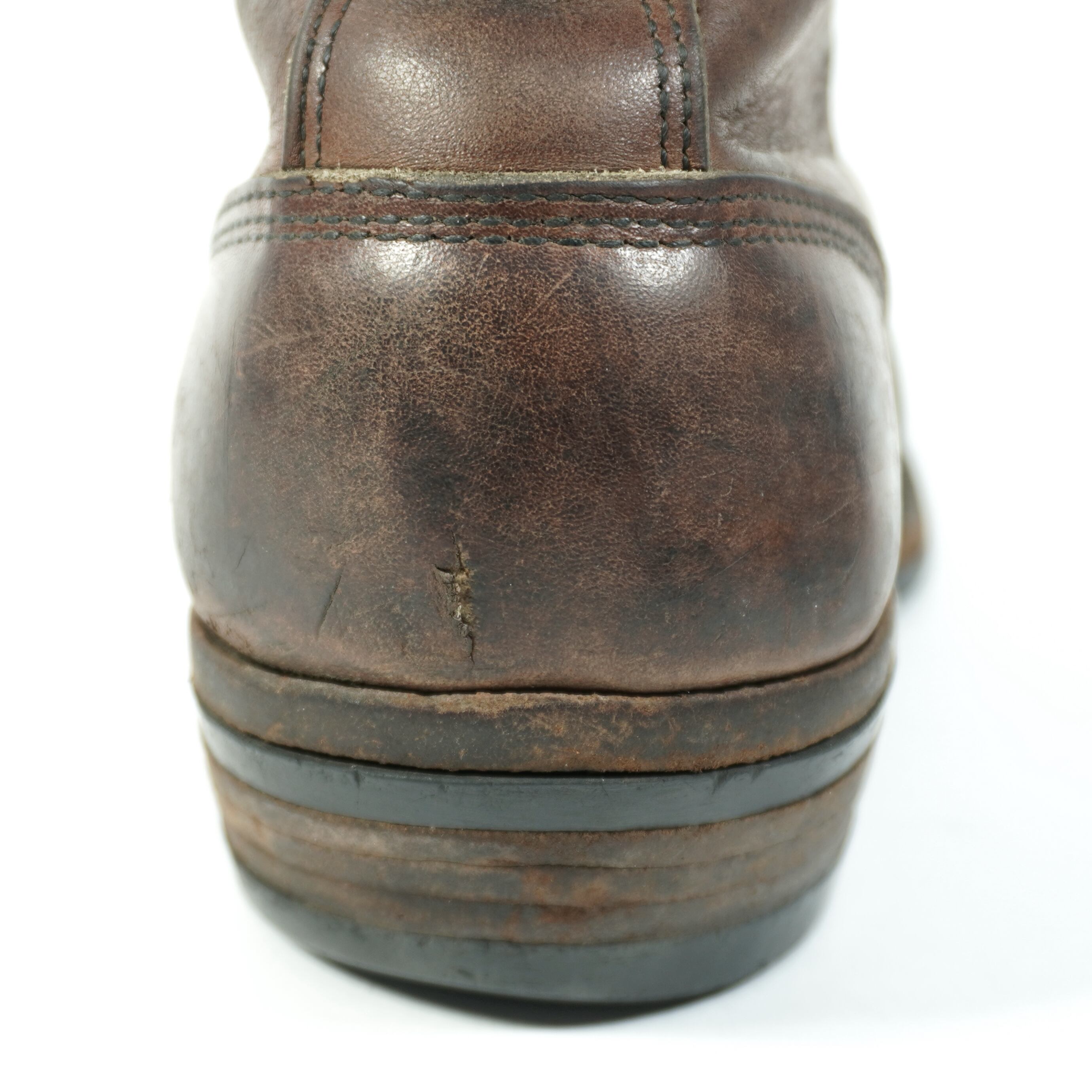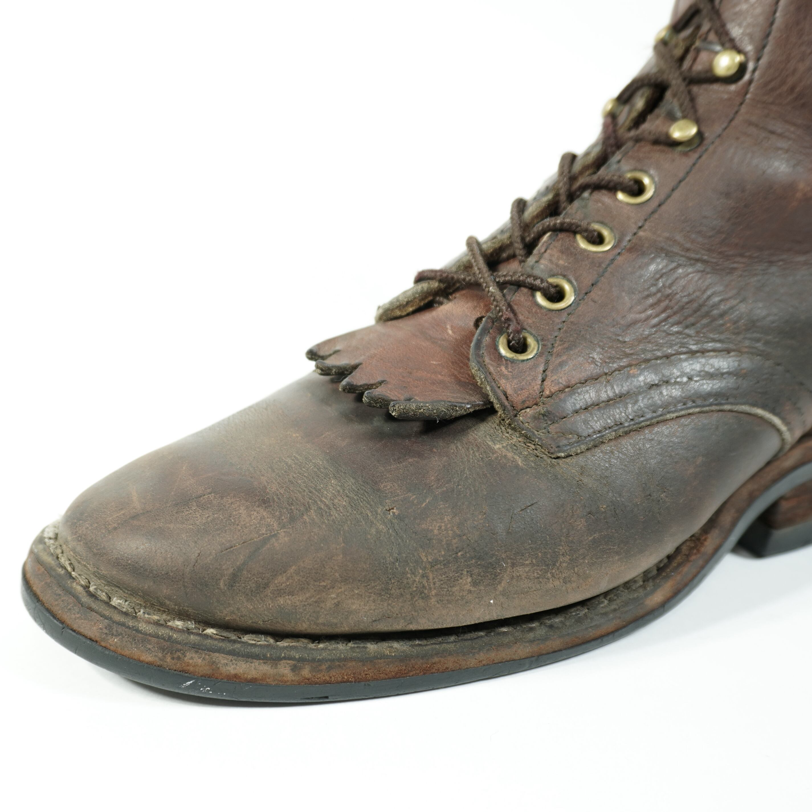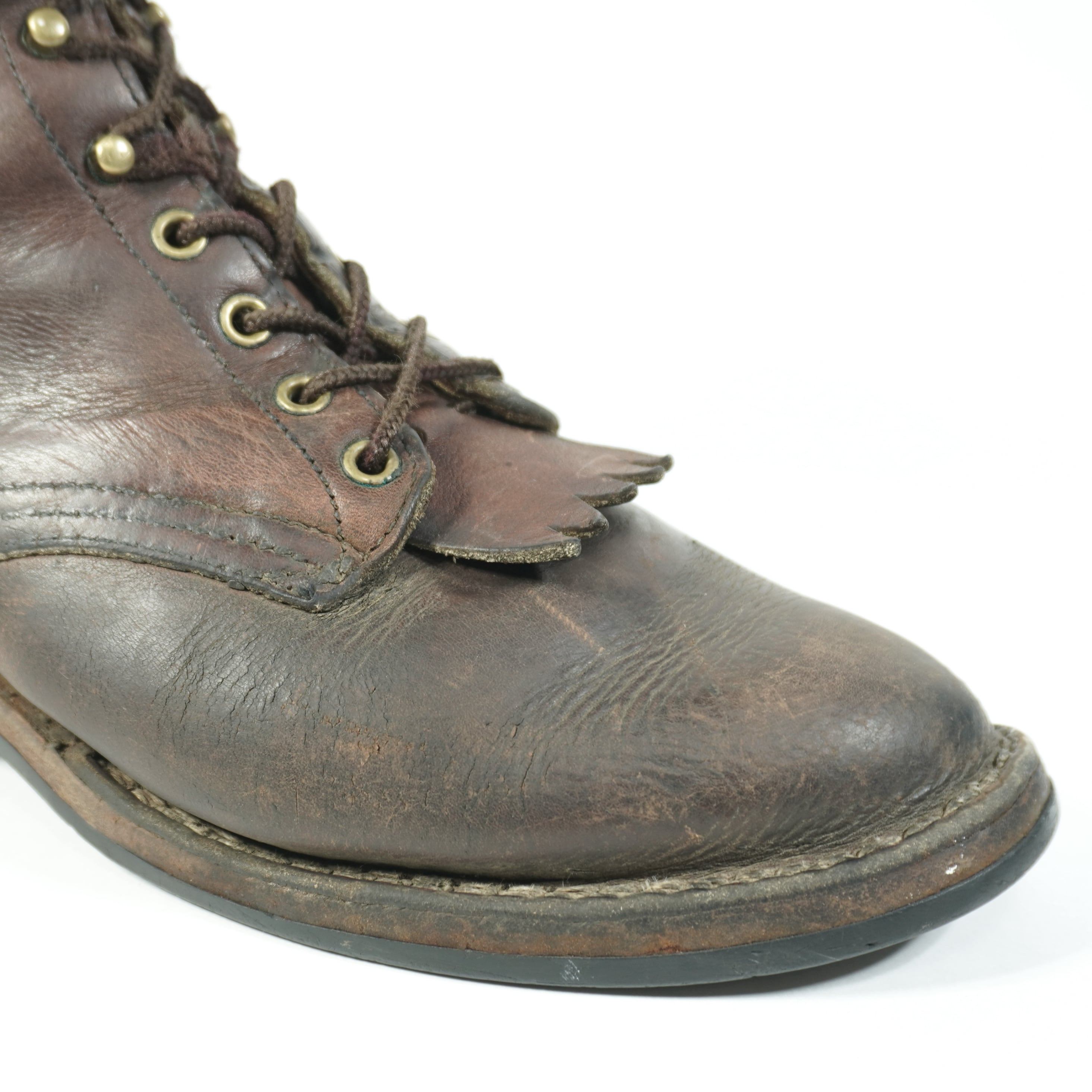 履き込まれていて、擦れやキズ、右足のタンが破れたのをリペア、ハトメに青錆、ソールに減りがあります。