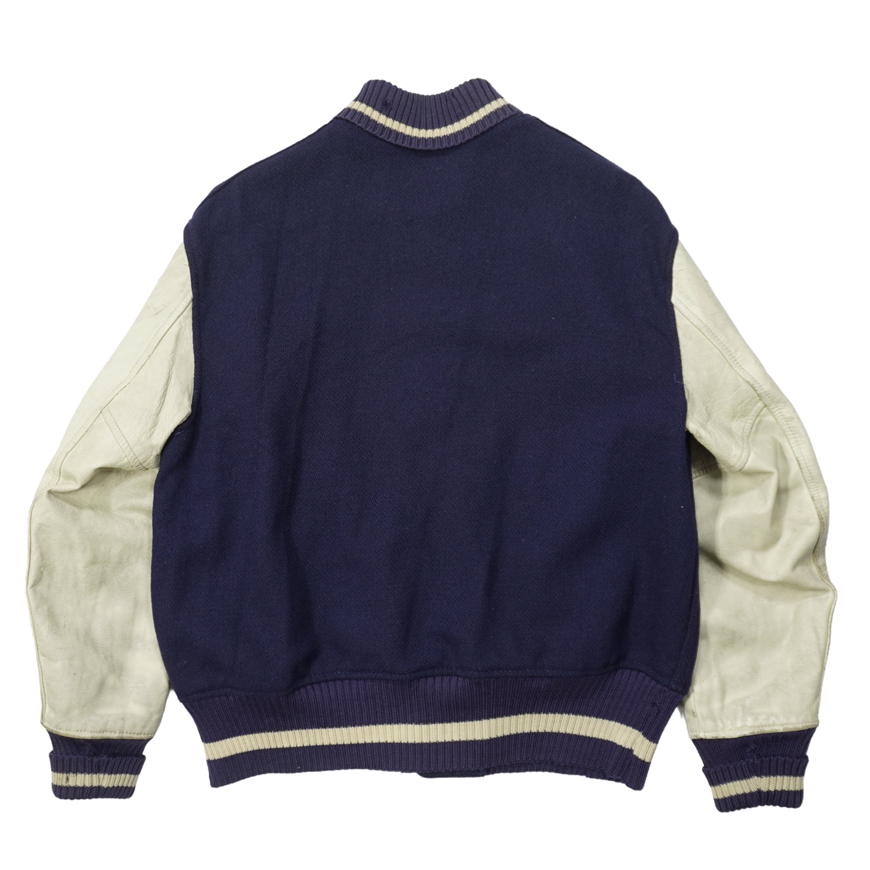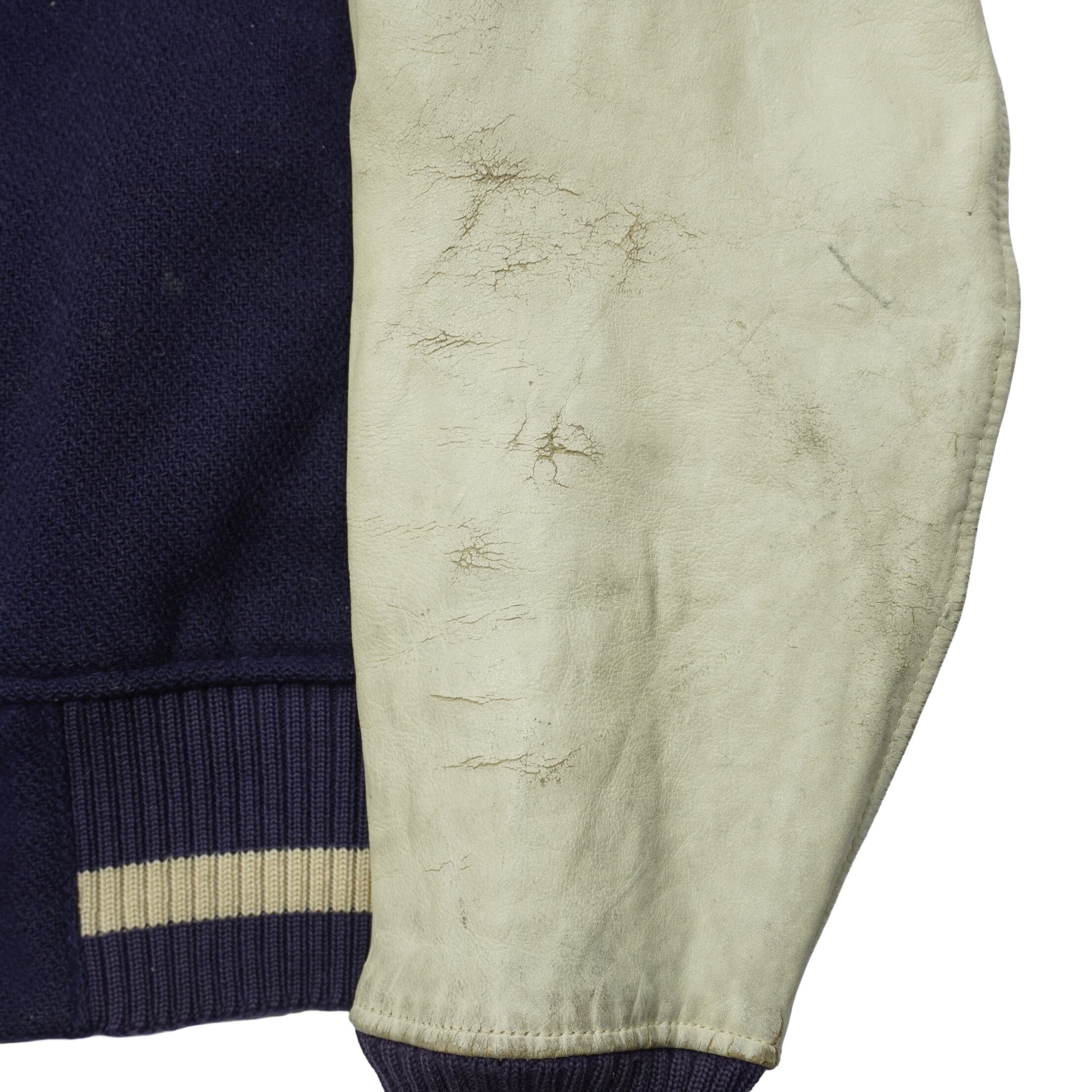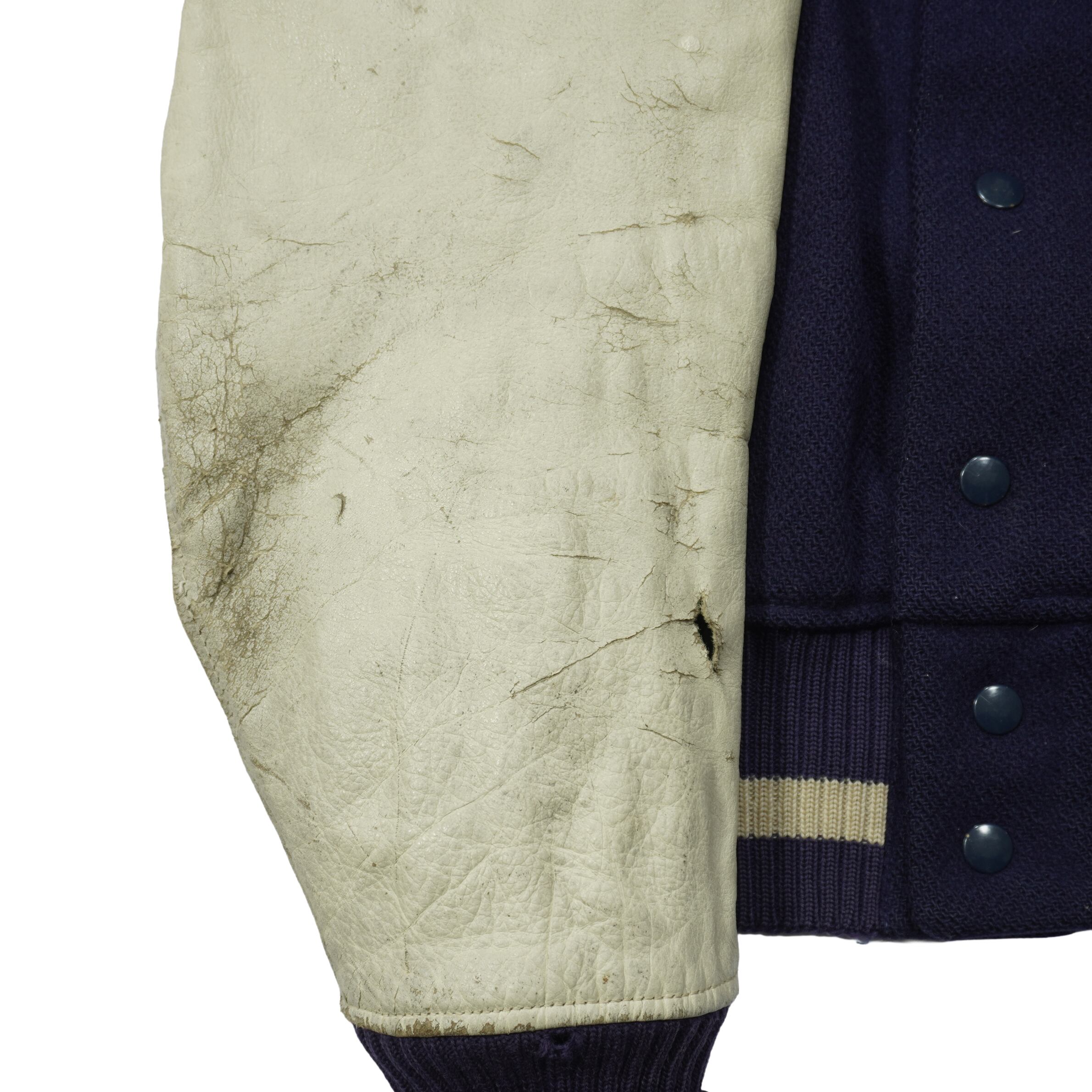 リブにダメージ、袖のレザーが硬化して擦れや破れ、ウールボディに薄汚れ、裏地に汚れがあります。