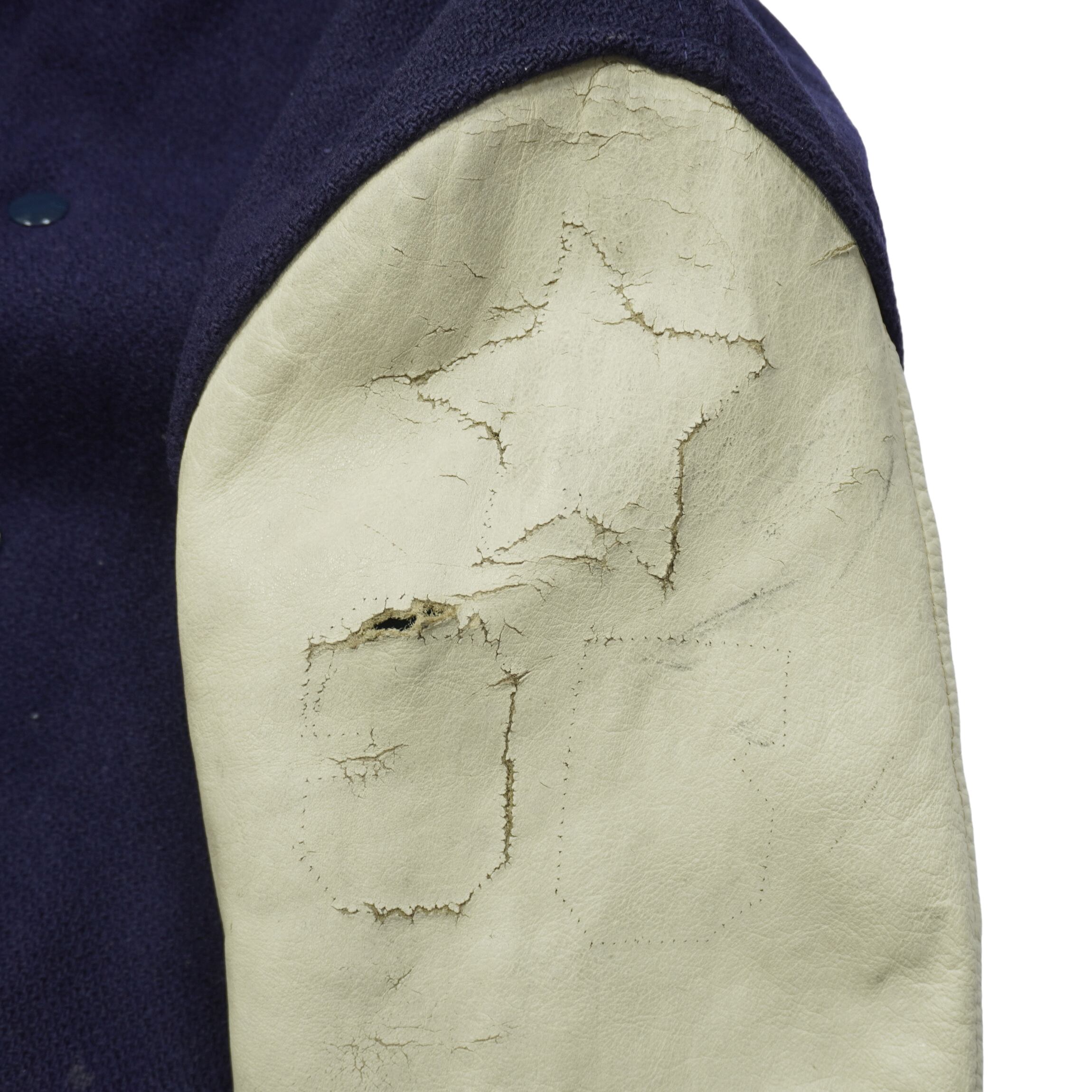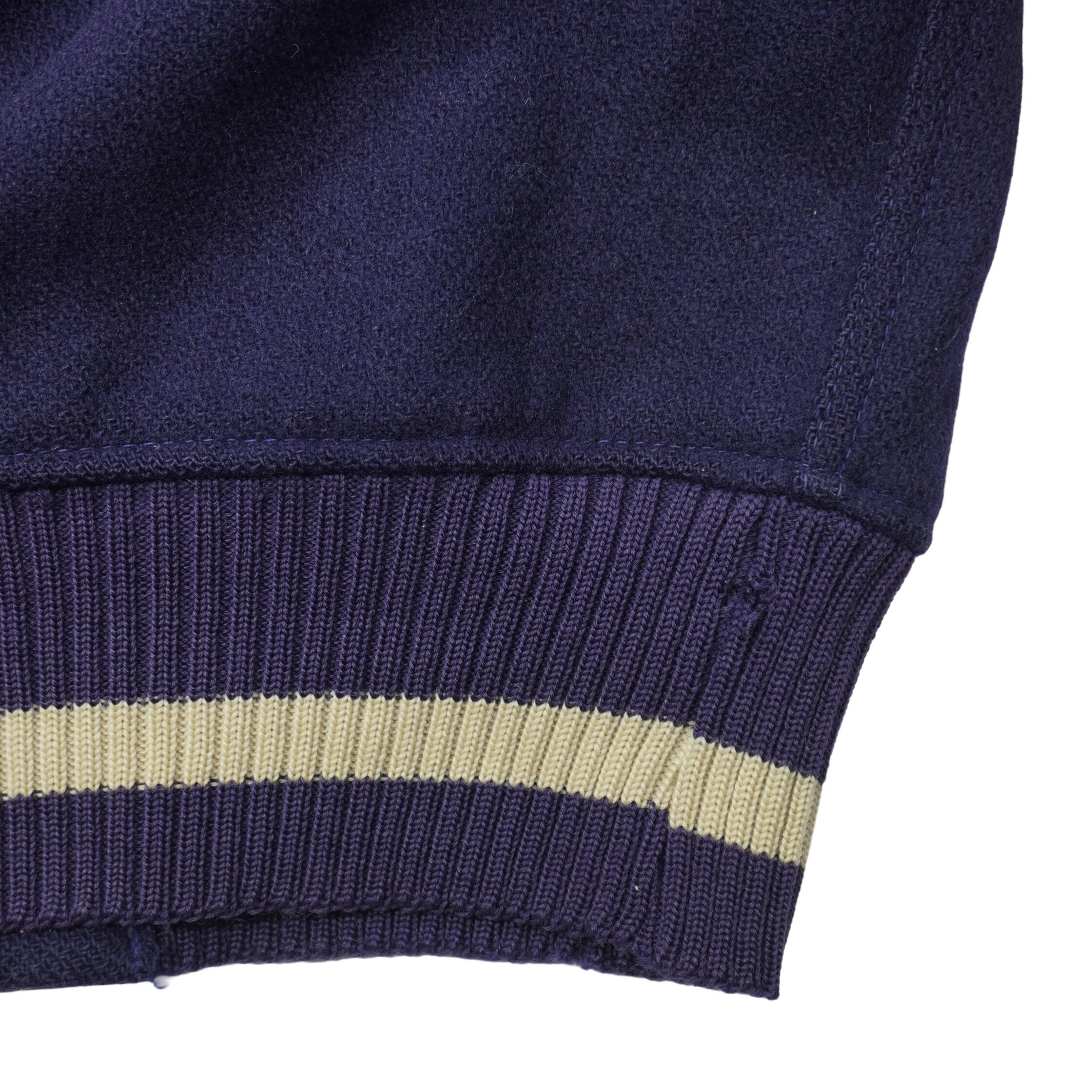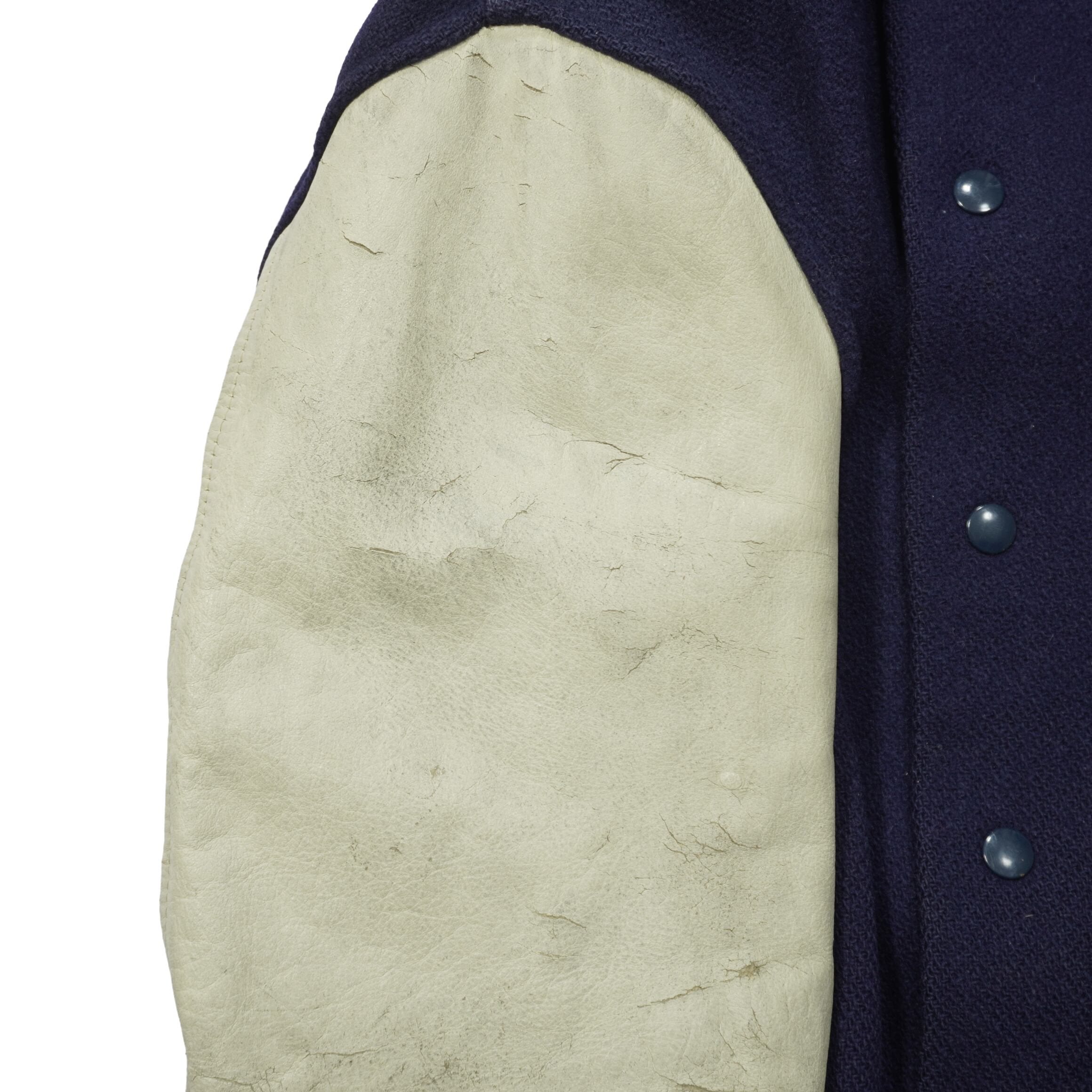 リブにダメージ、袖のレザーが硬化して擦れや破れ、ウールボディに薄汚れ、裏地に汚れがあります。