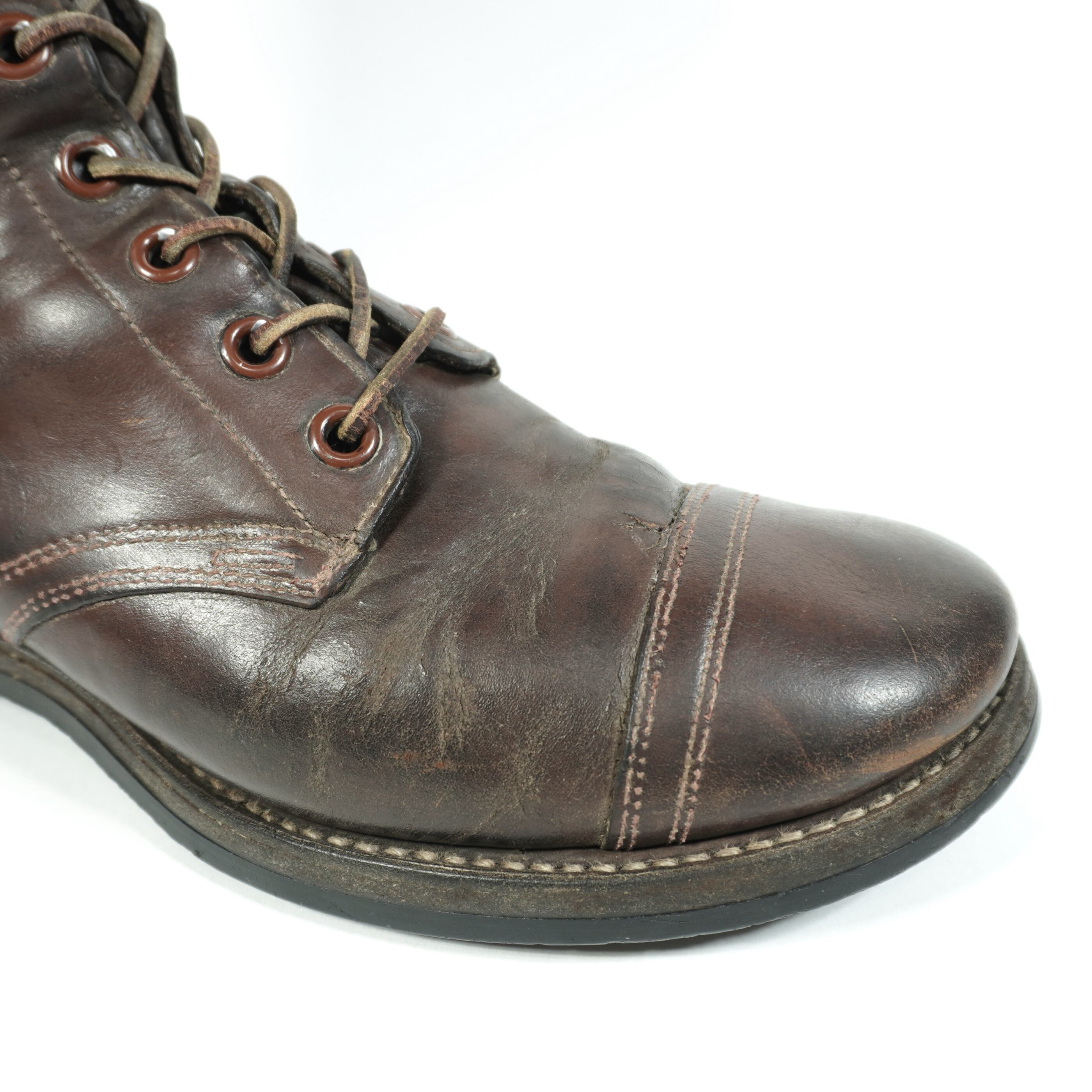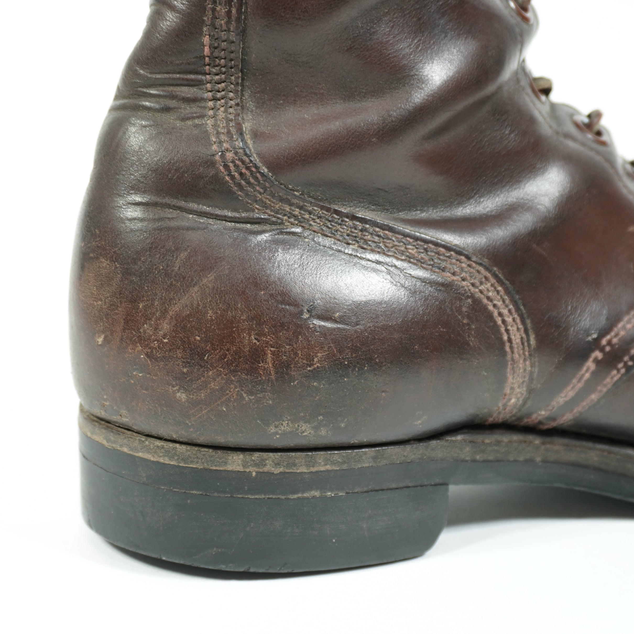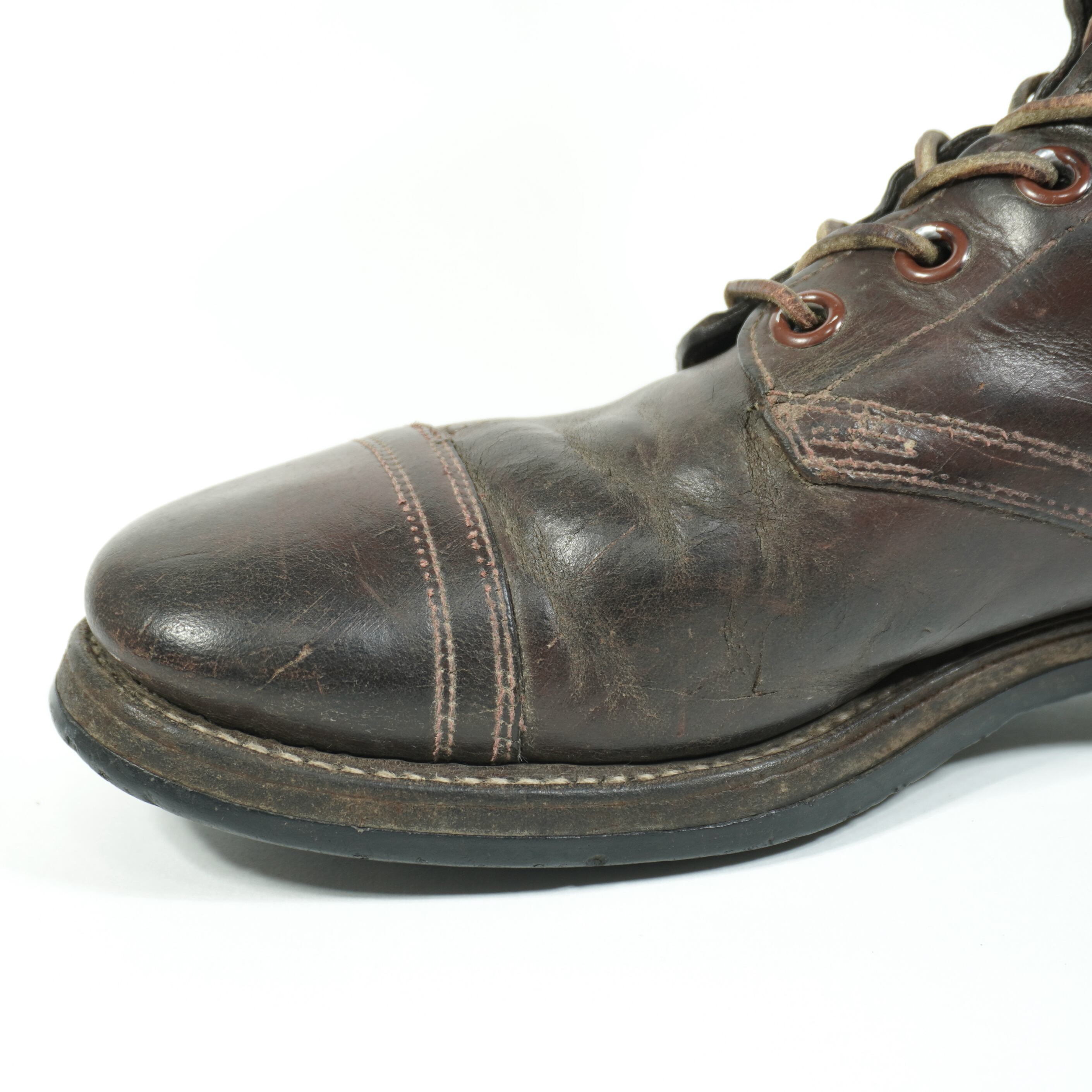 履き込まれていて、擦れやキズ、右足の甲部分に割れがあり裏側から革を当ててリペアしてあります、ソールに減りがあります。