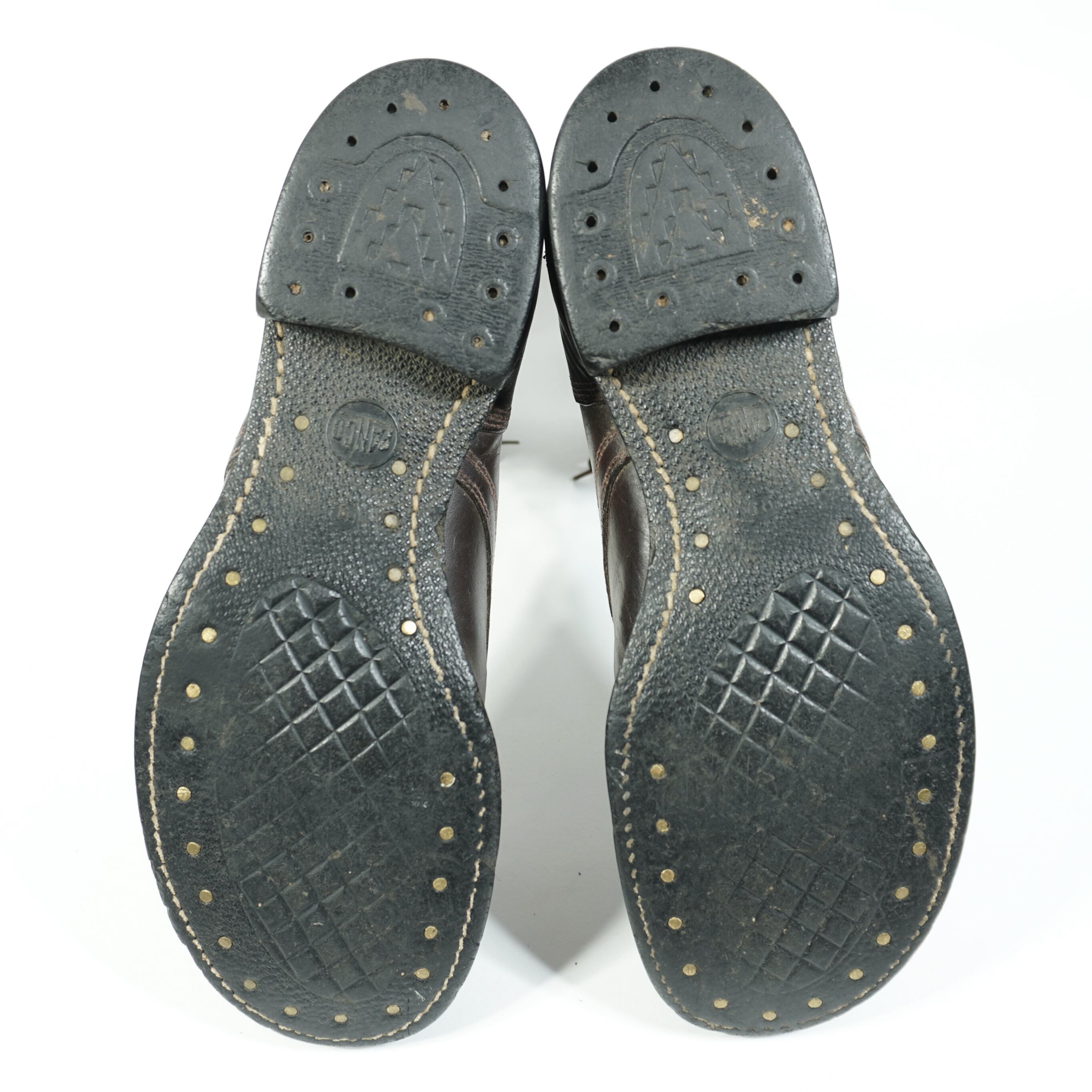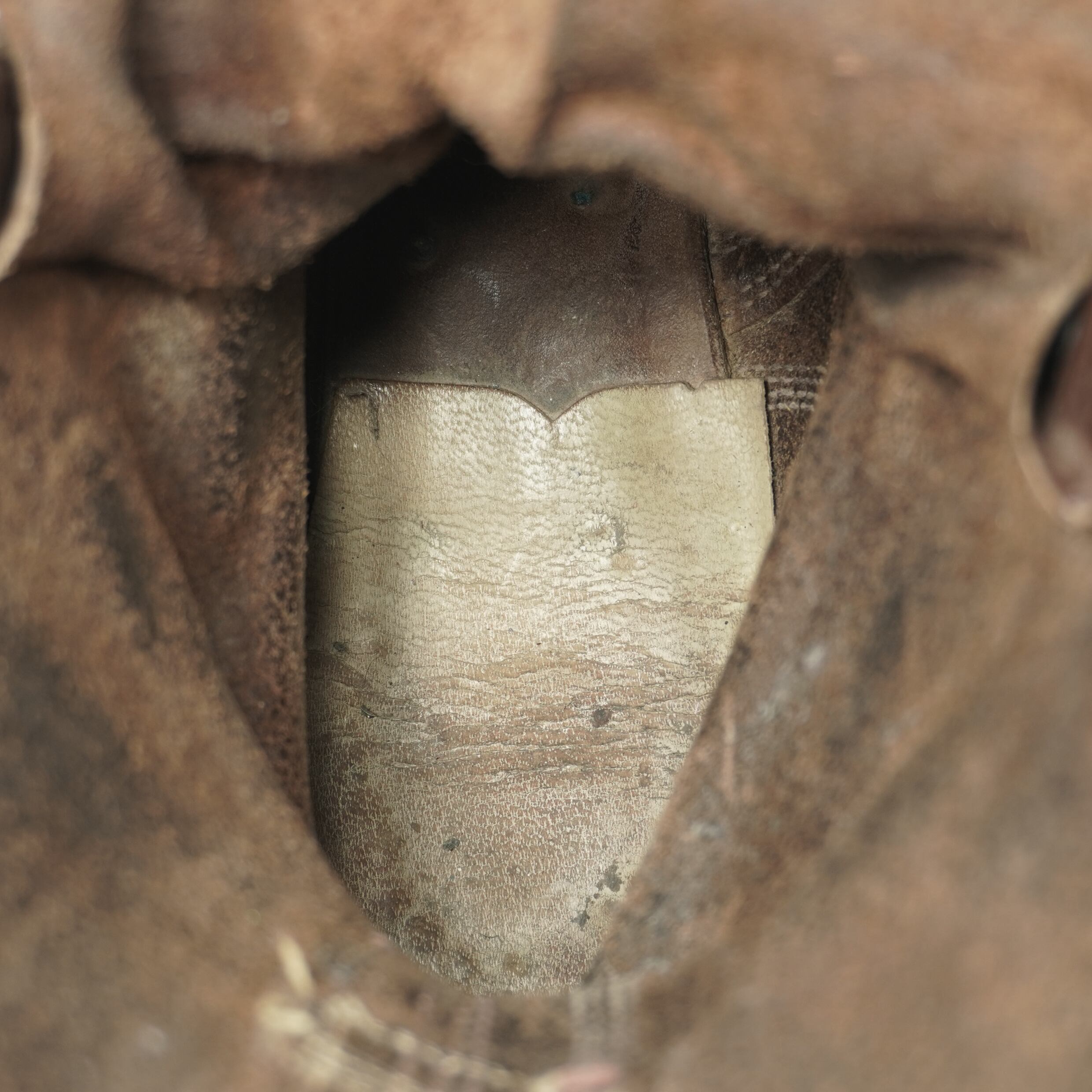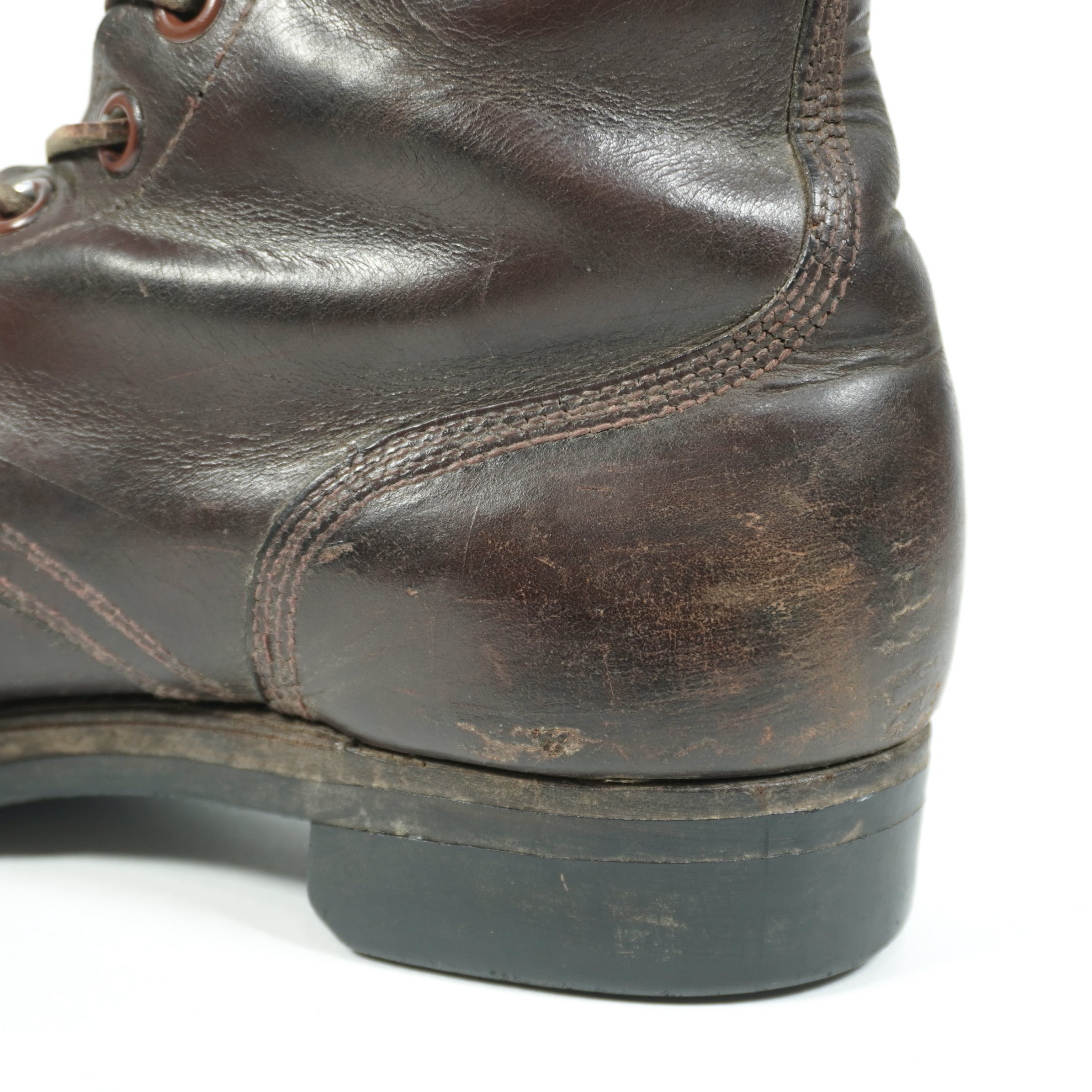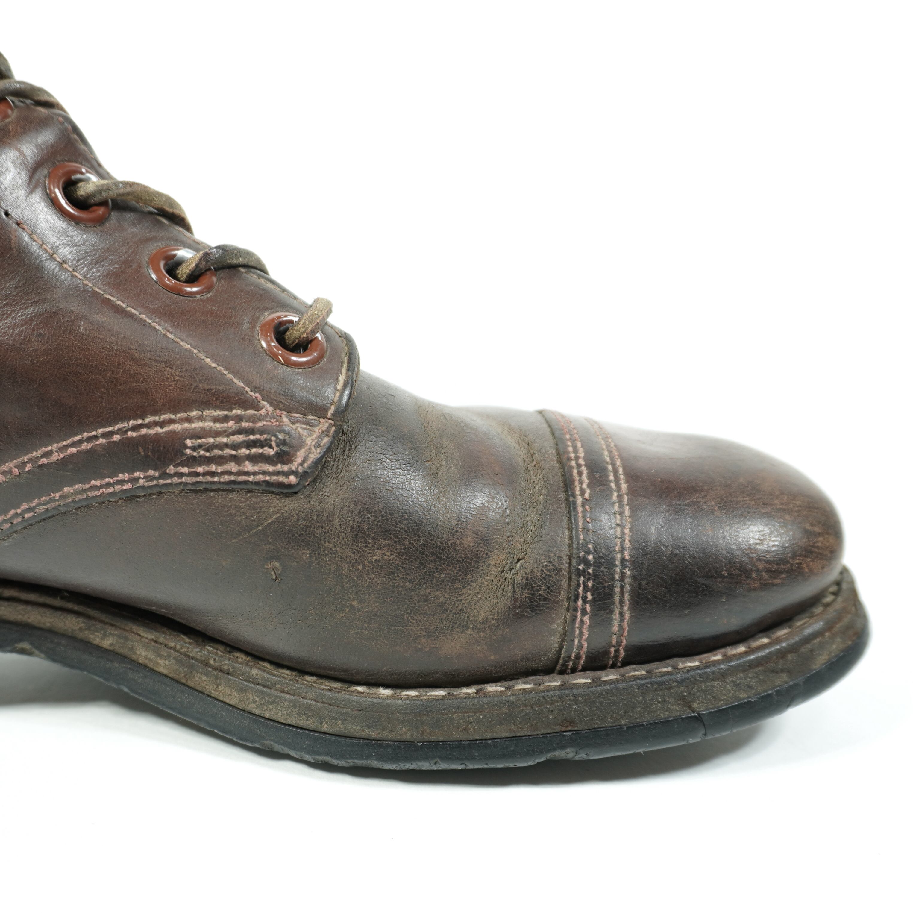 履き込まれていて、擦れやキズ、右足の甲部分に割れがあり裏側から革を当ててリペアしてあります、ソールに減りがあります。