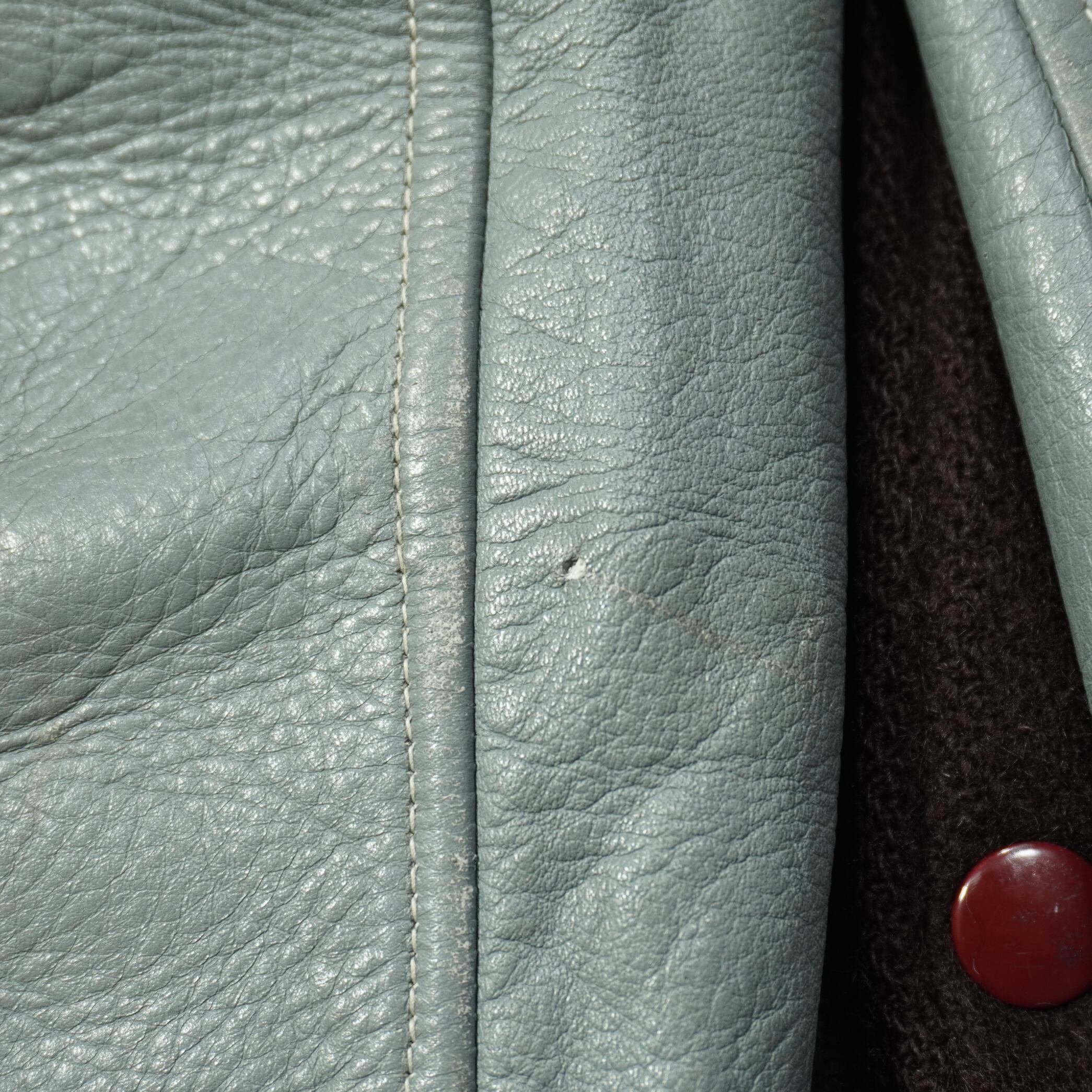 右裾に小さい破れ、袖のレザーに擦れ小傷、裏地に破れがあります。