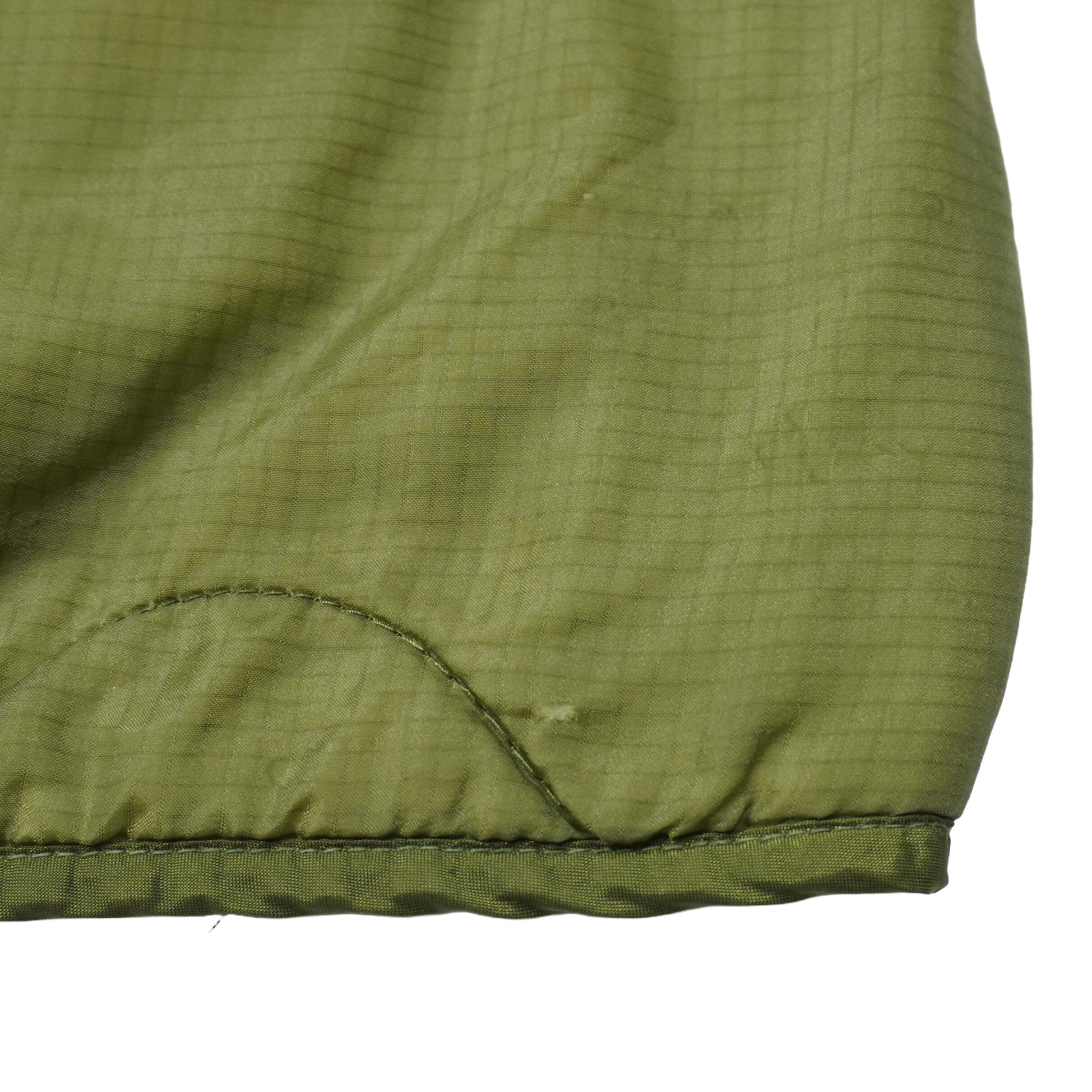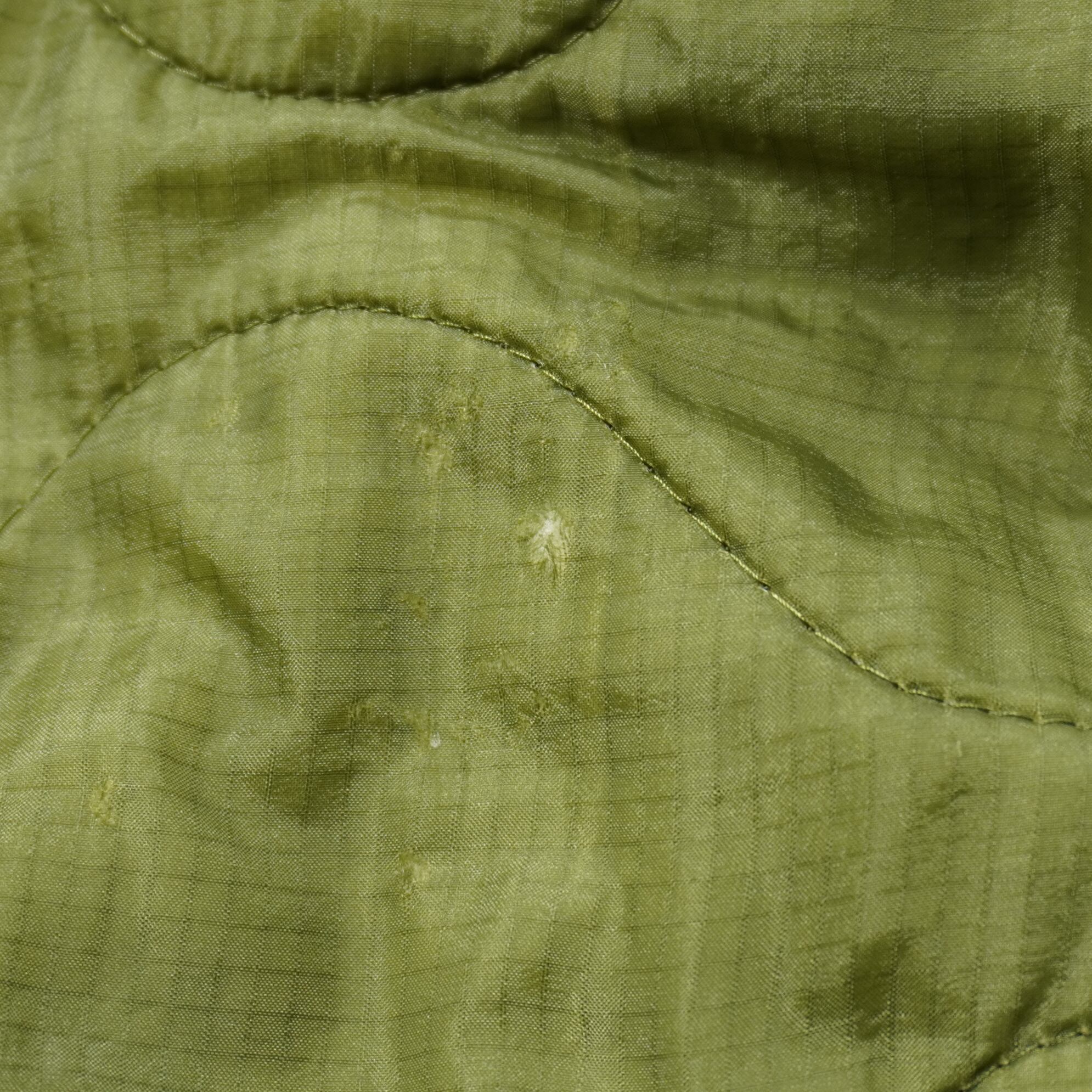 左前裾に小さい破れ、右前身頃の裏地側に破れ、キルティングステッチにほつれがあります。