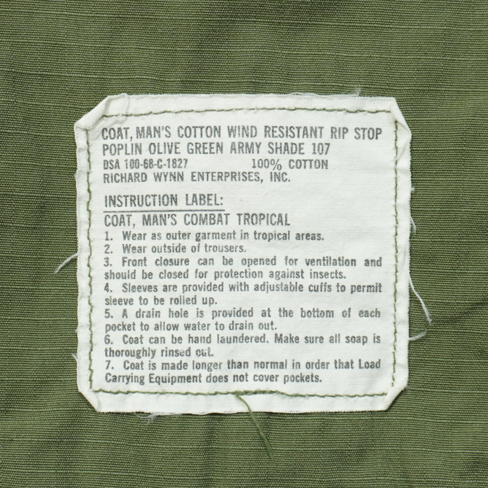 COAT, MAN'S COTTON WIND RESISTANT RIP STOP POPLIN OLIVE GREEN ARMY SHADE 107