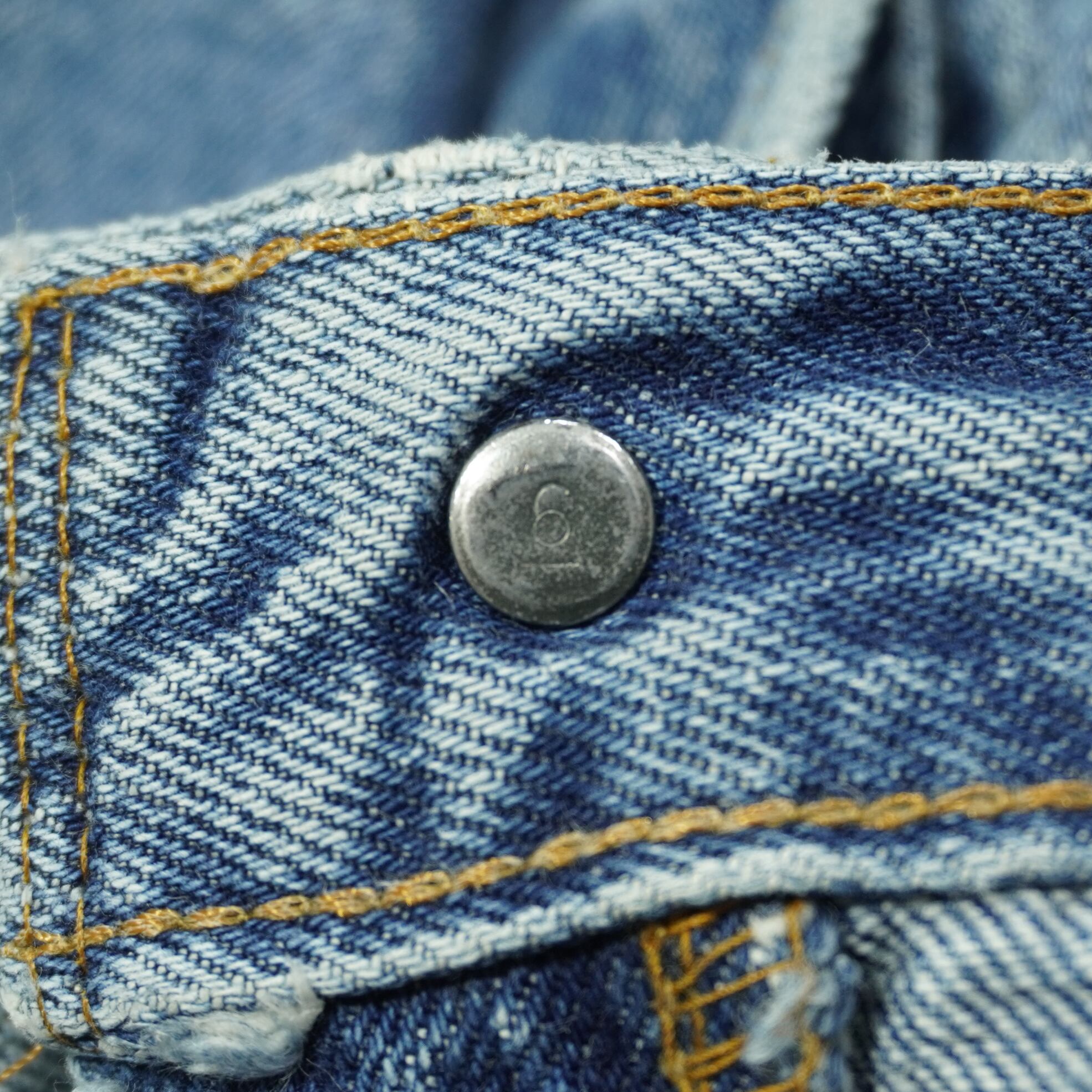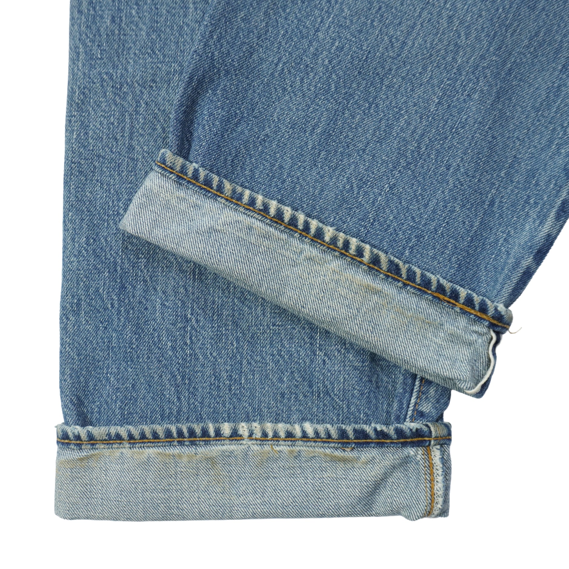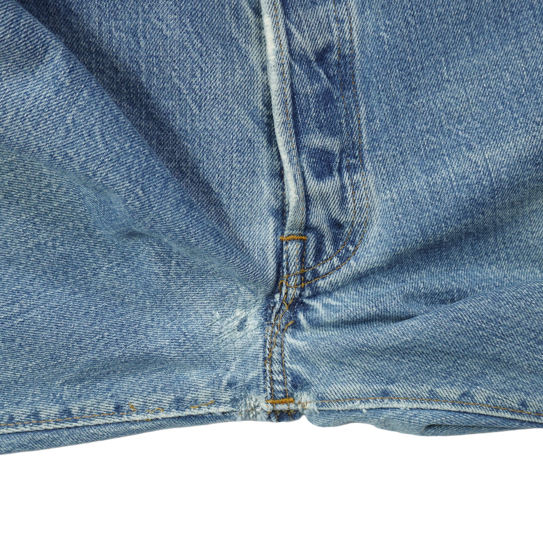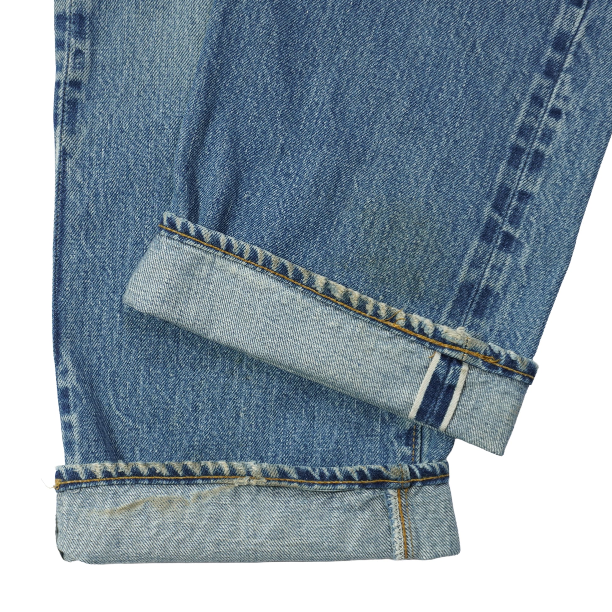 前ポケット口に擦れ、アウトシームに擦れ、ボタンホールのステッチほつれ、股上と股下にリペア、裾先に擦れ、右の膝裏にリペア、汚れがあります。