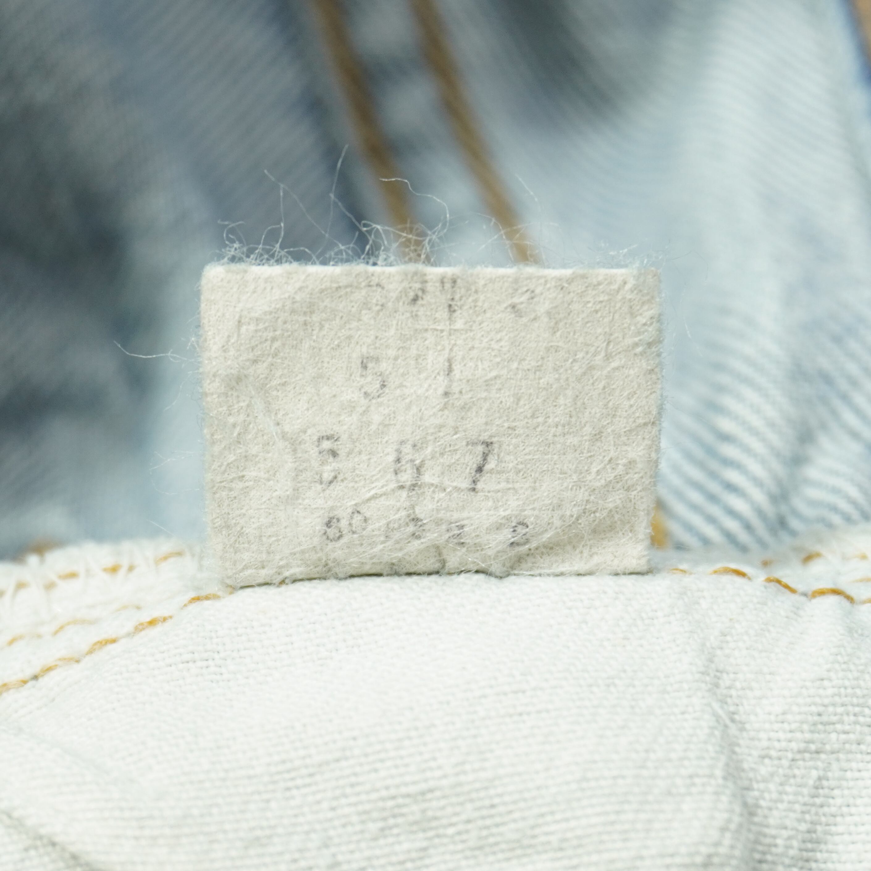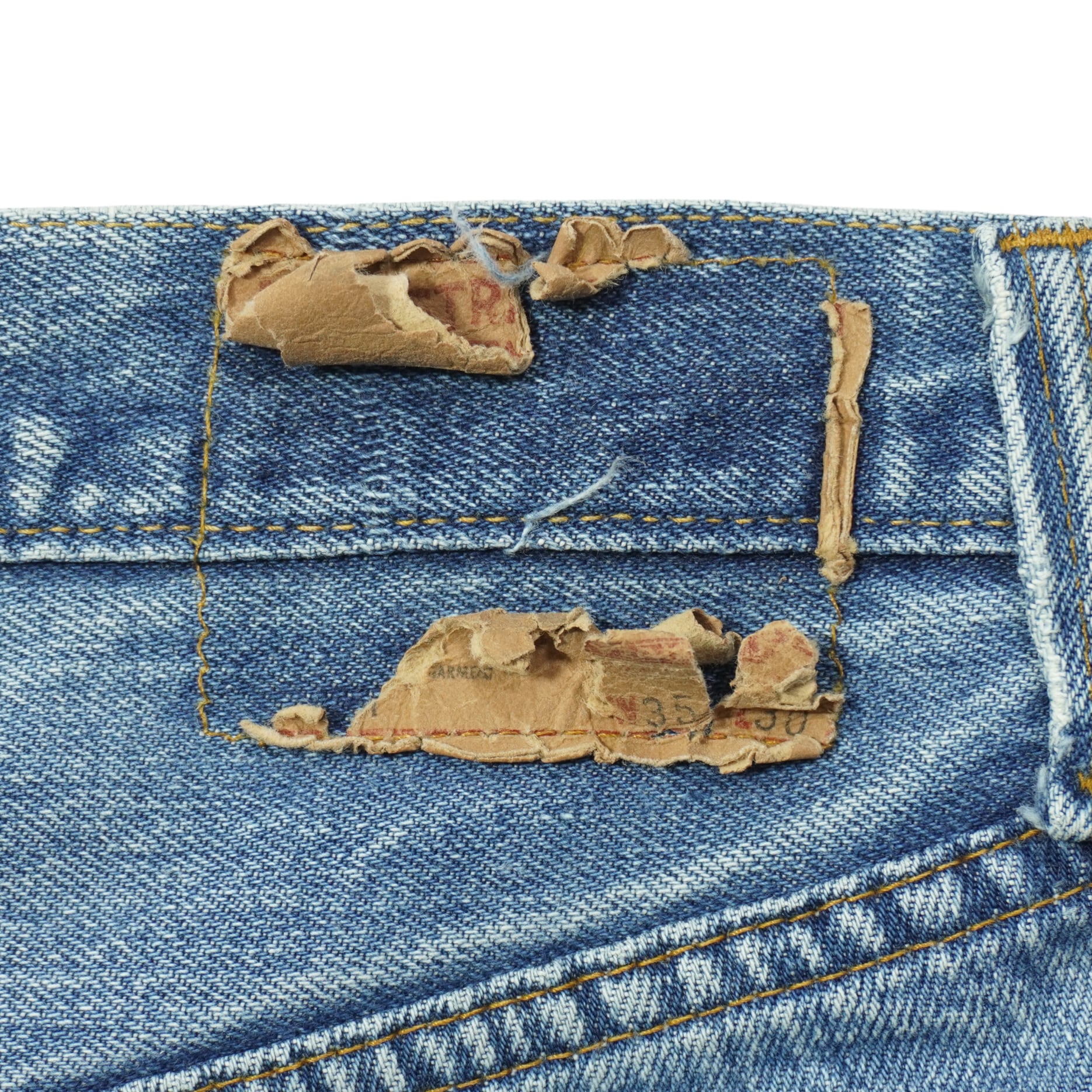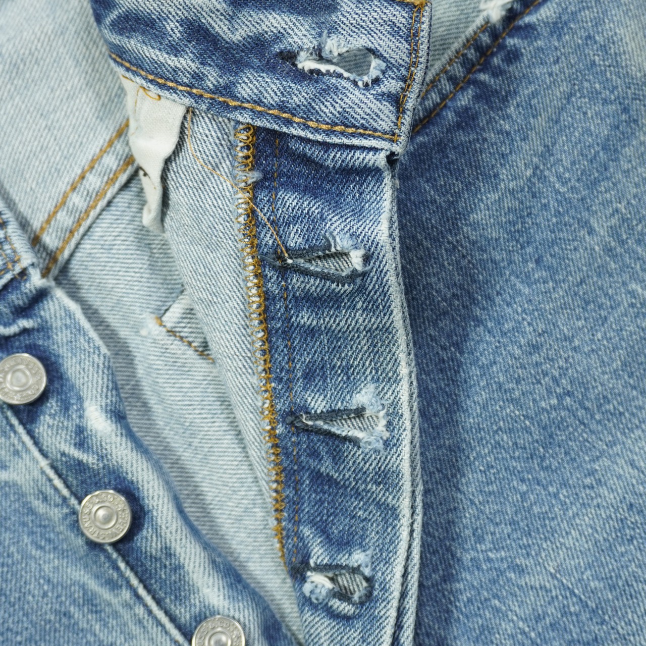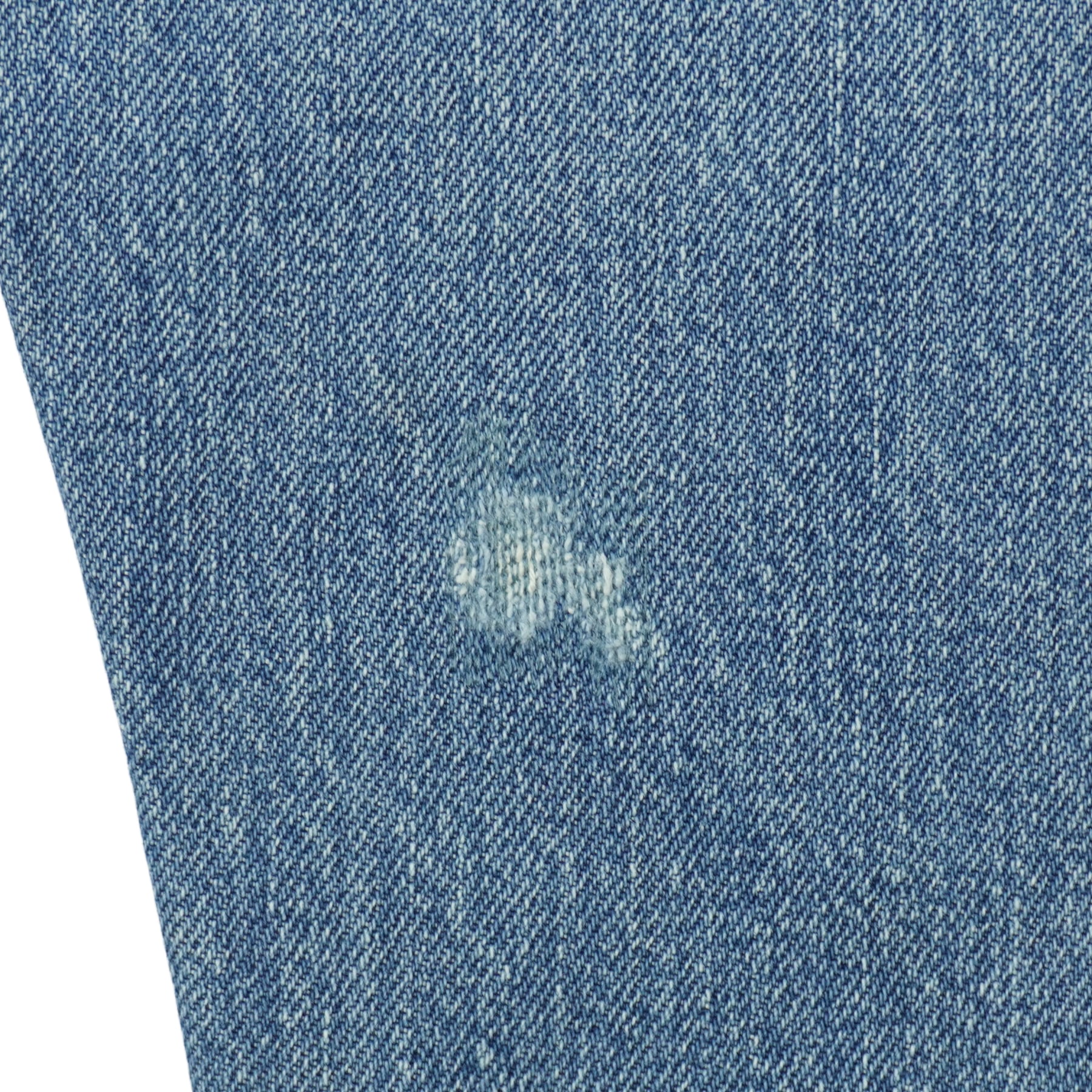前ポケット口に擦れ、アウトシームに擦れ、ボタンホールのステッチほつれ、股上と股下にリペア、裾先に擦れ、右の膝裏にリペア、汚れがあります。