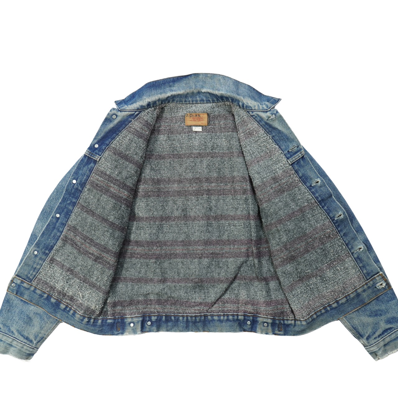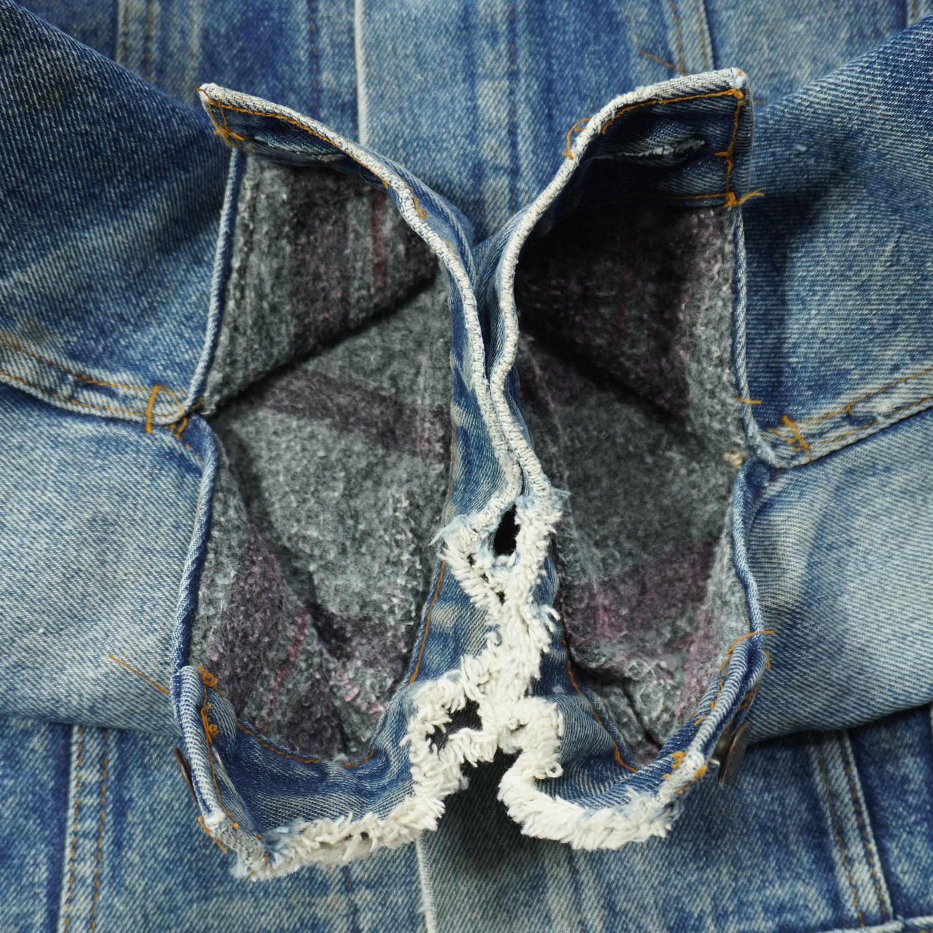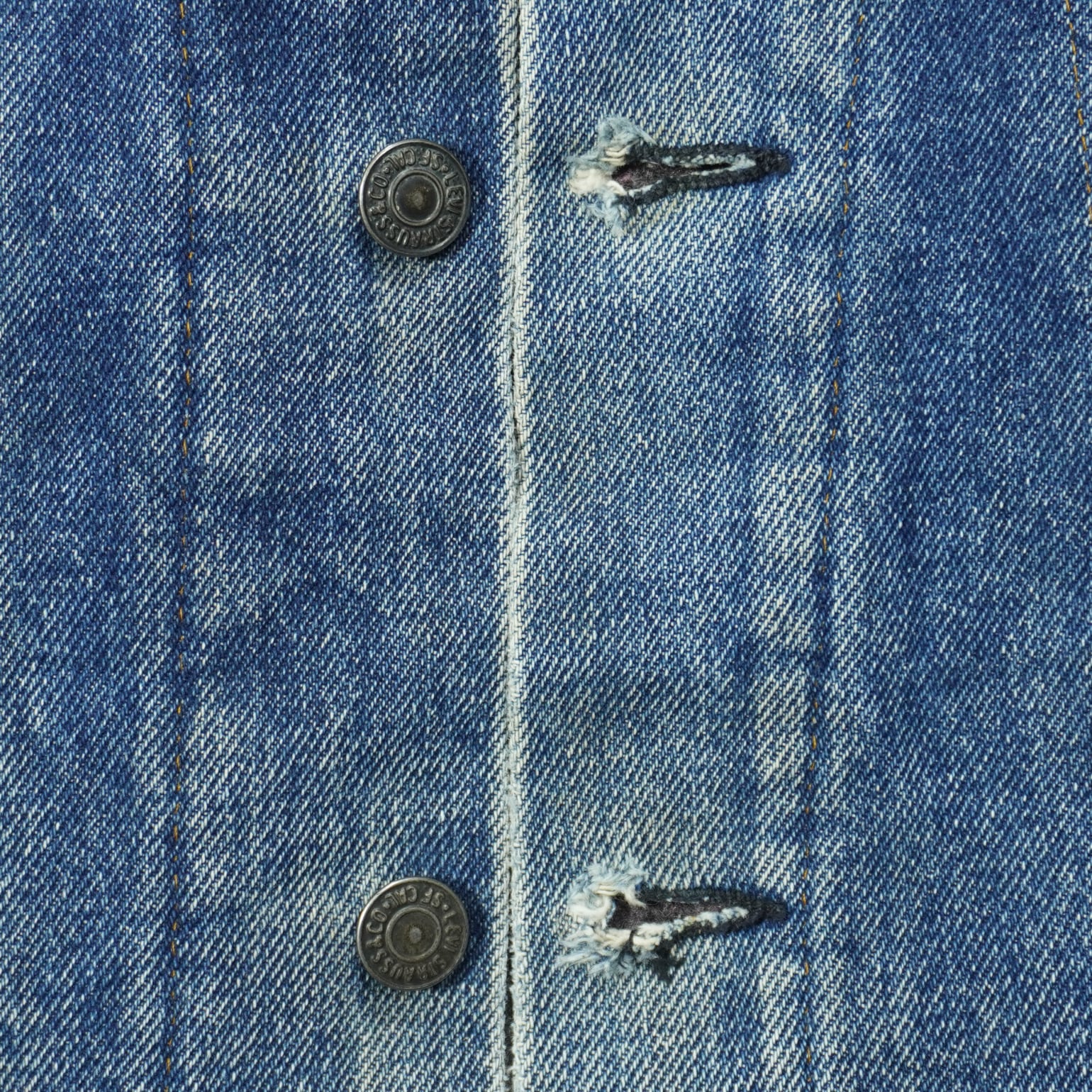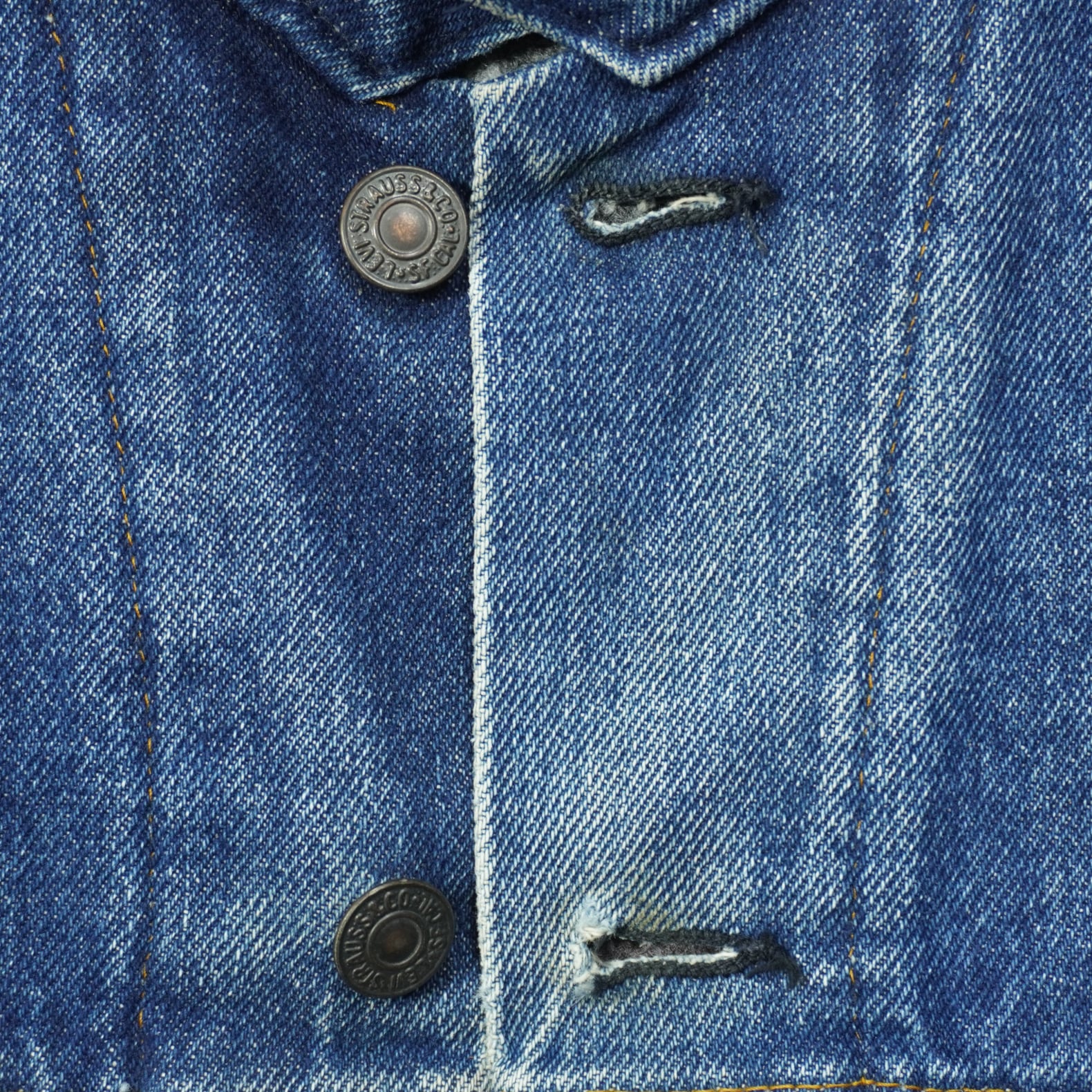 前たてのボタンホールにほつれ、裾に擦れ、袖に汚れ、袖先に擦れ破れがあります。