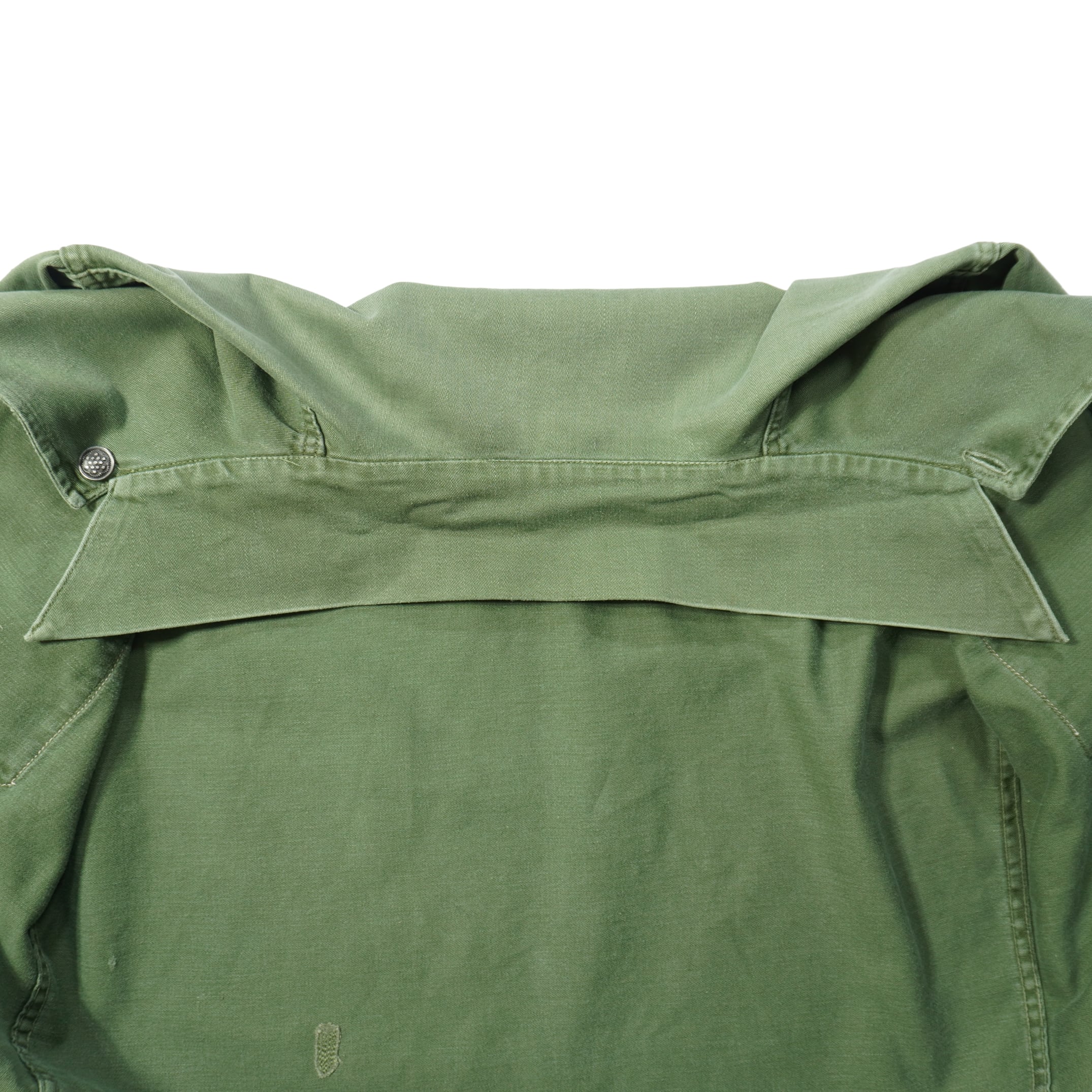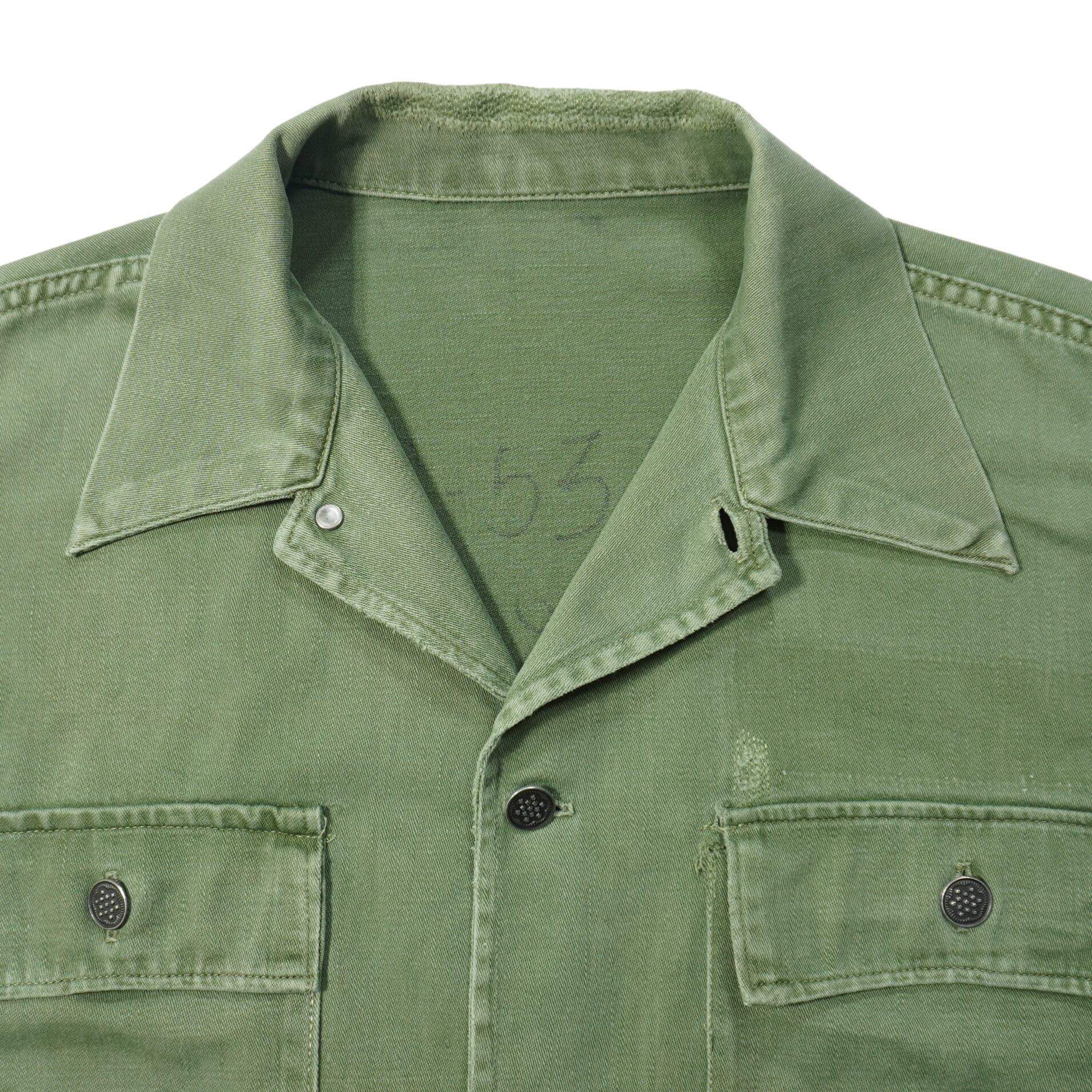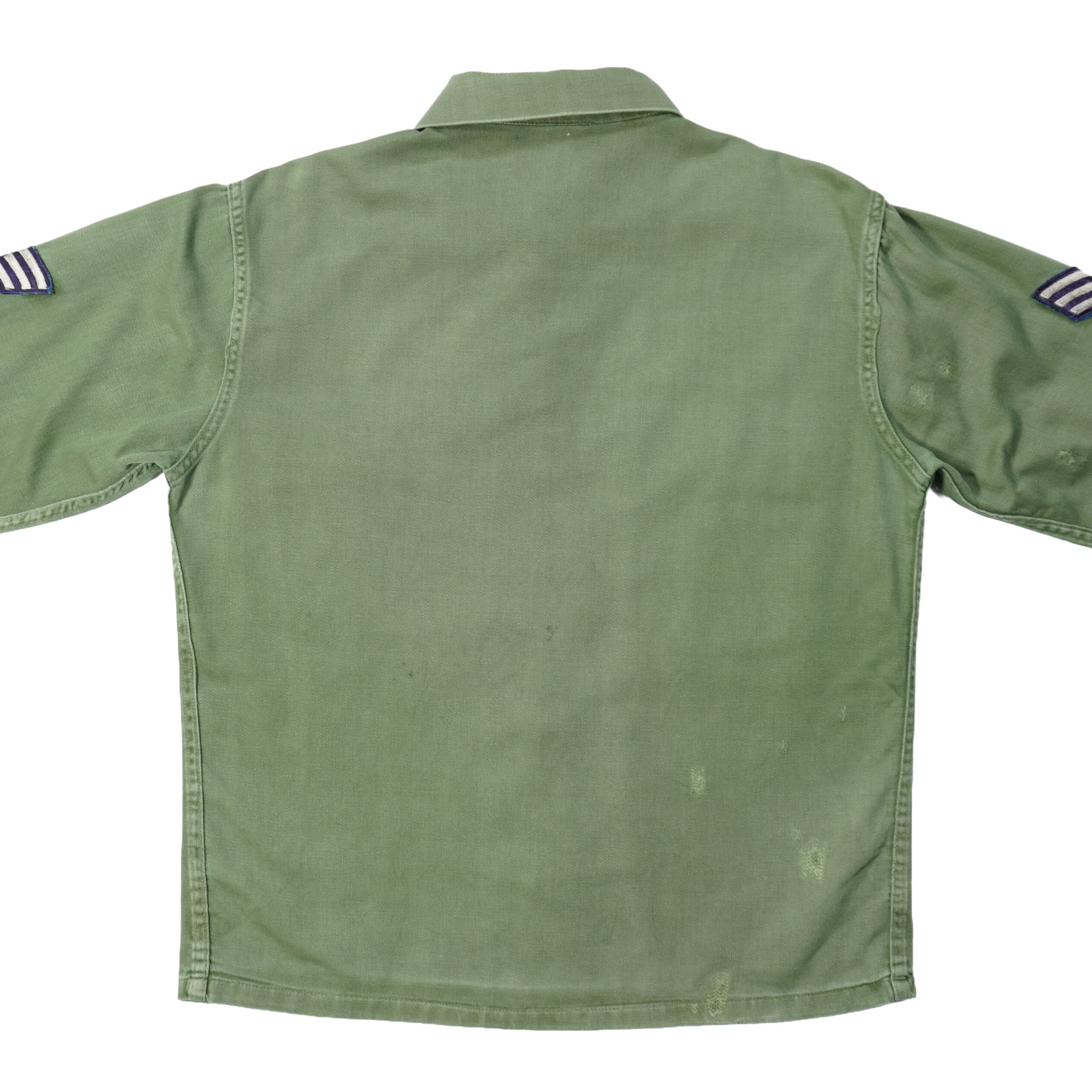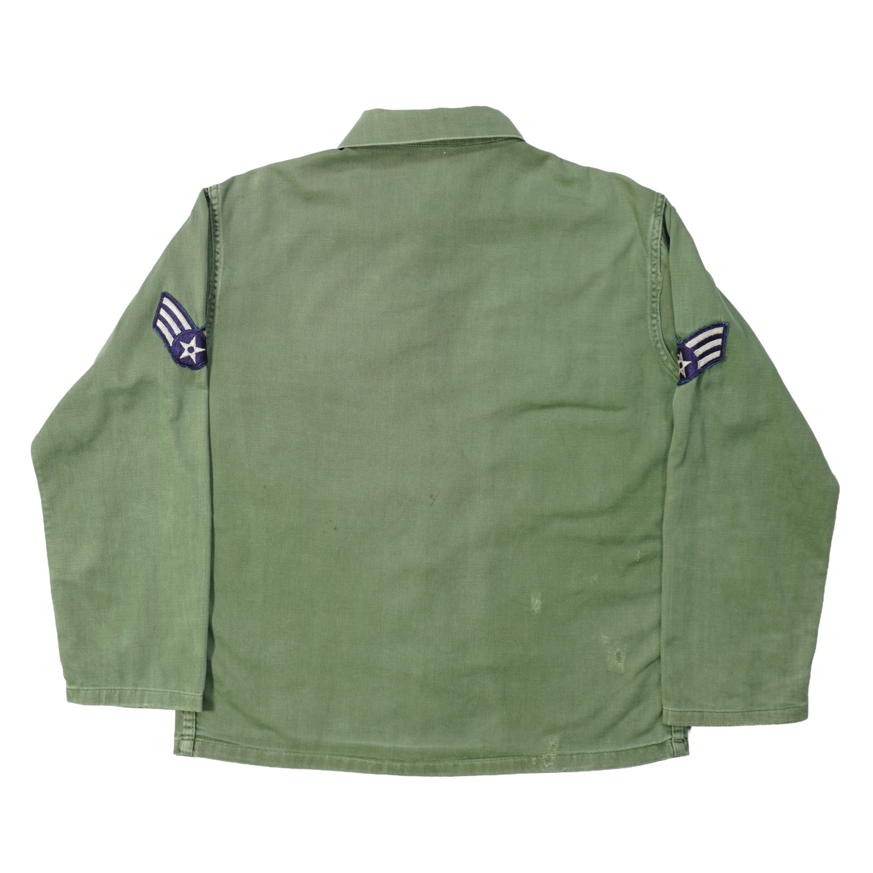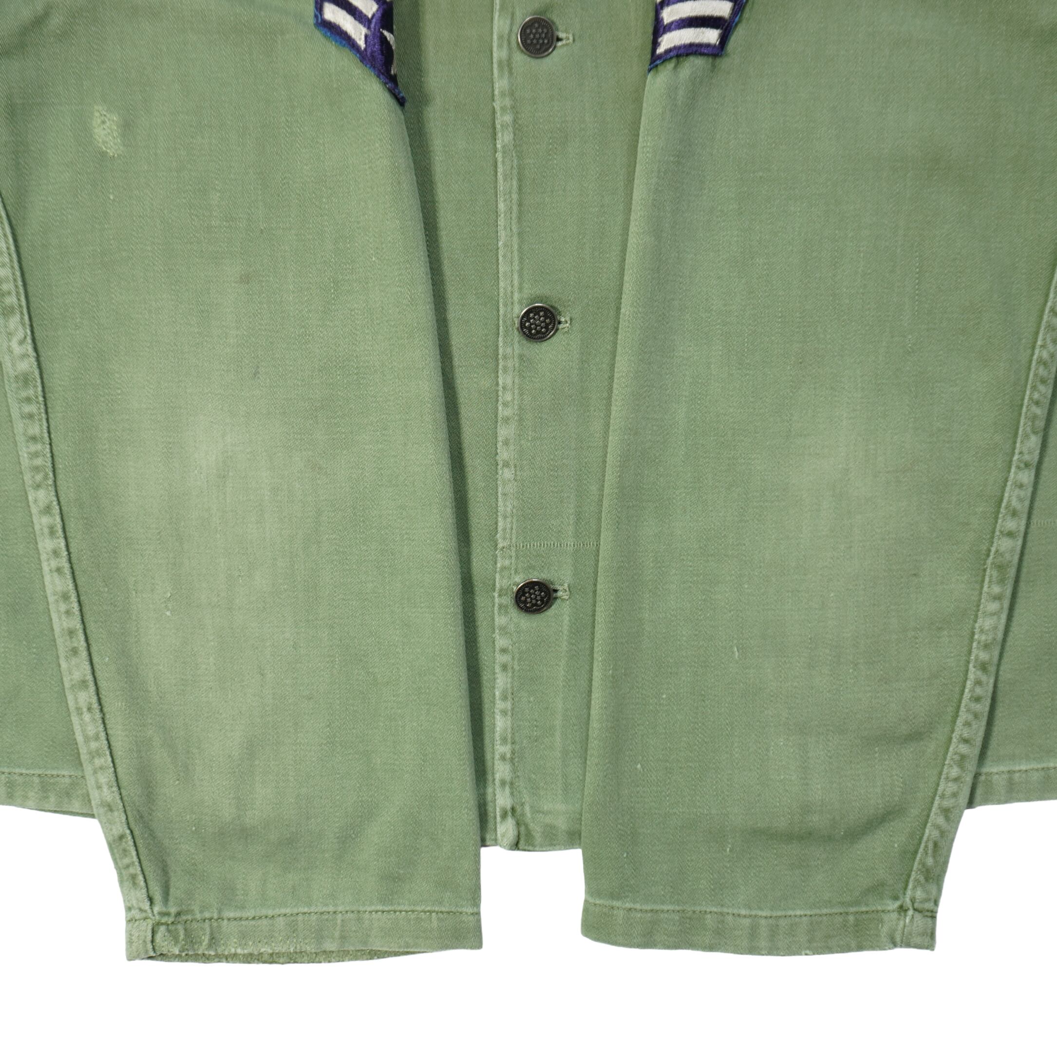 左胸上部と右袖と右袖先と襟と背中にリペア、袖先に擦れ、汚れがあります。