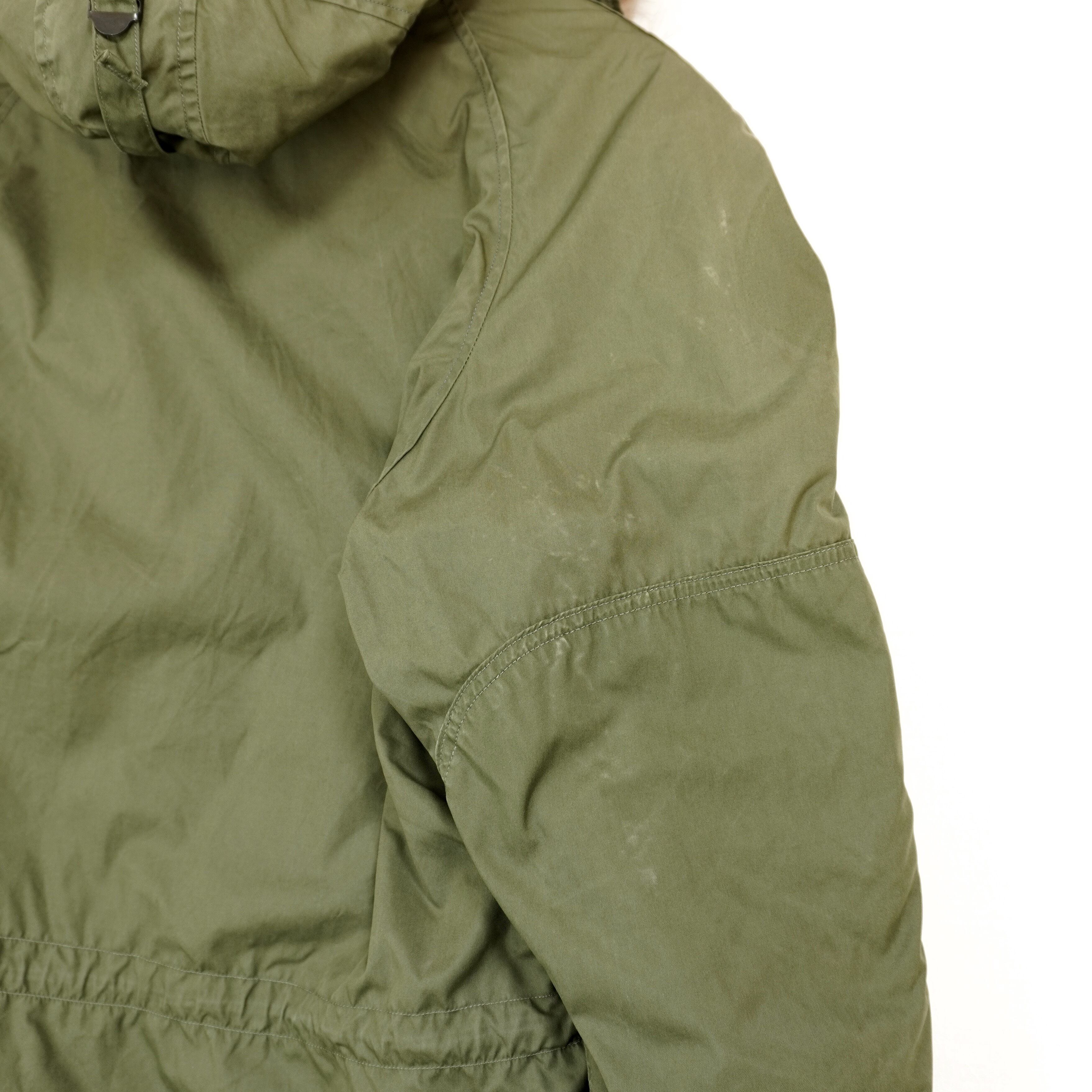 右袖にリブにほつれ、右袖と背中に擦れによる色落ちが目立つ部分があります。