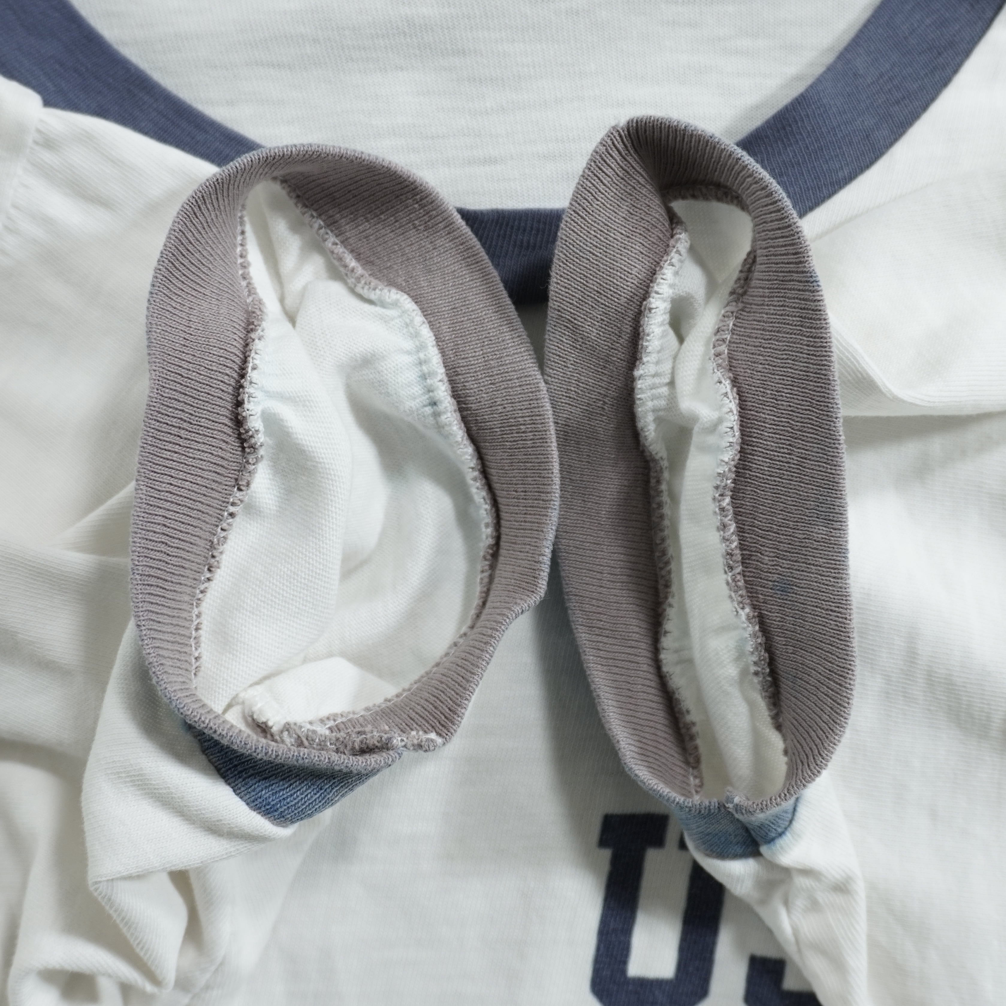 腹部に汚れ、袖のブルートリムが褪色、襟リブに小穴があります。