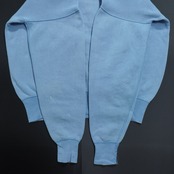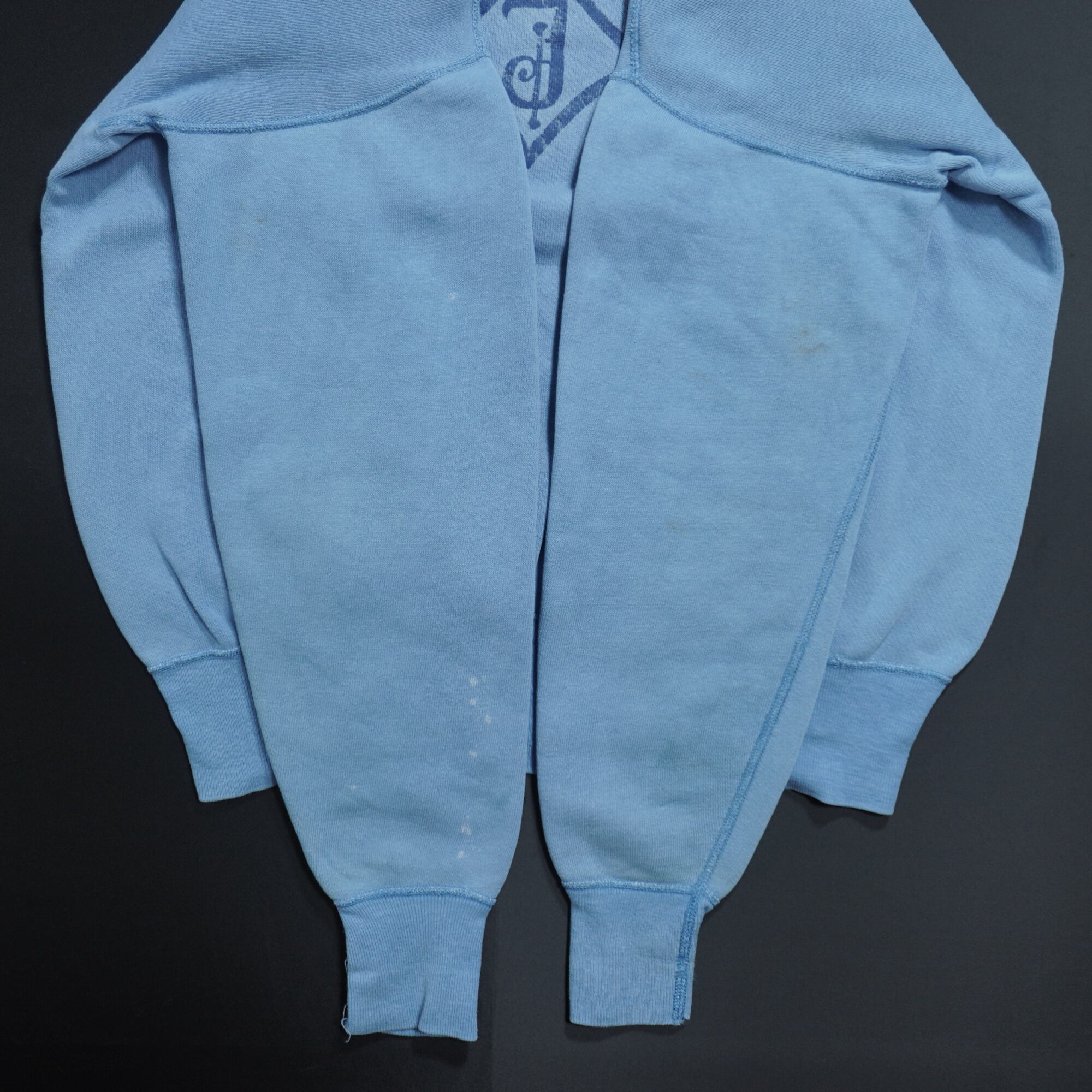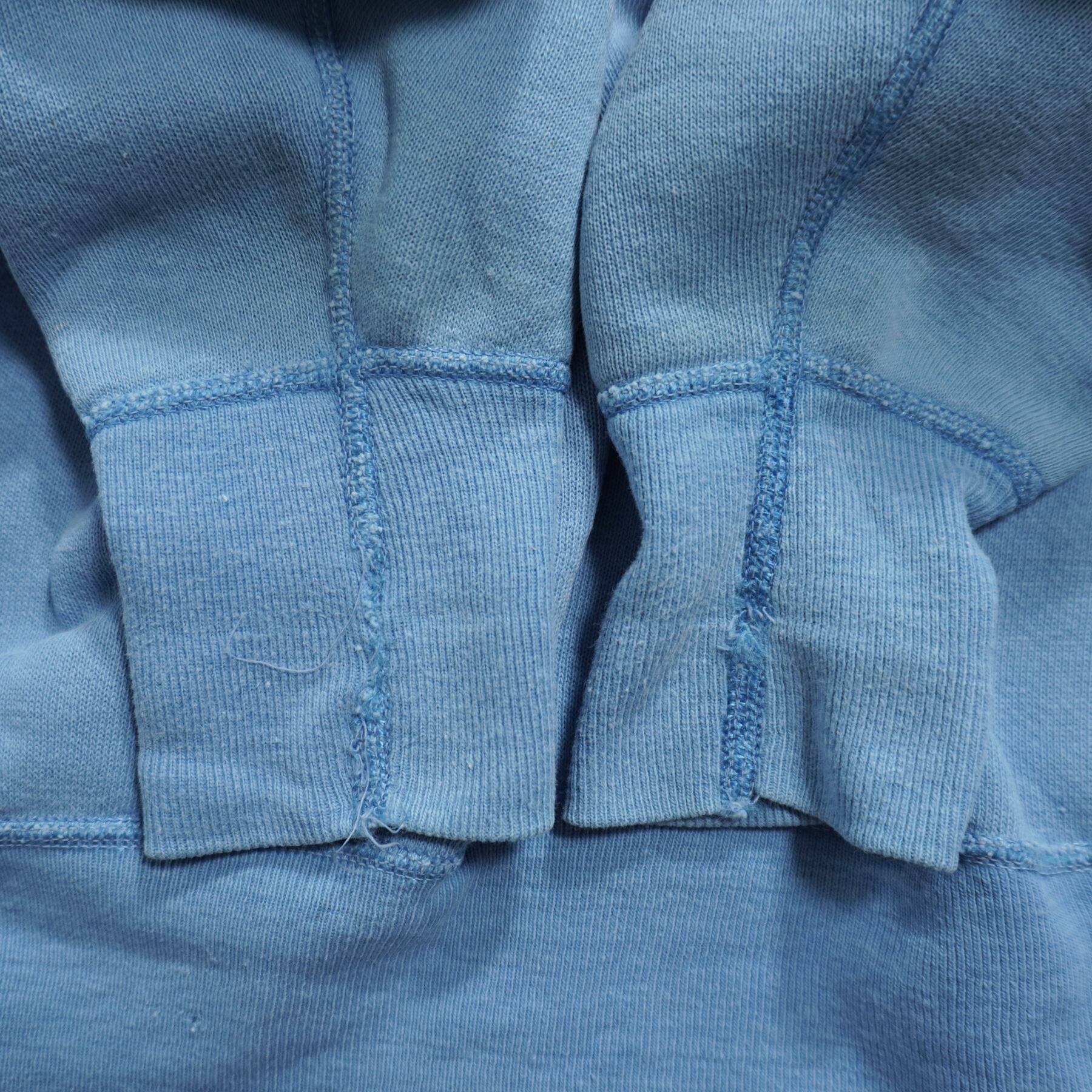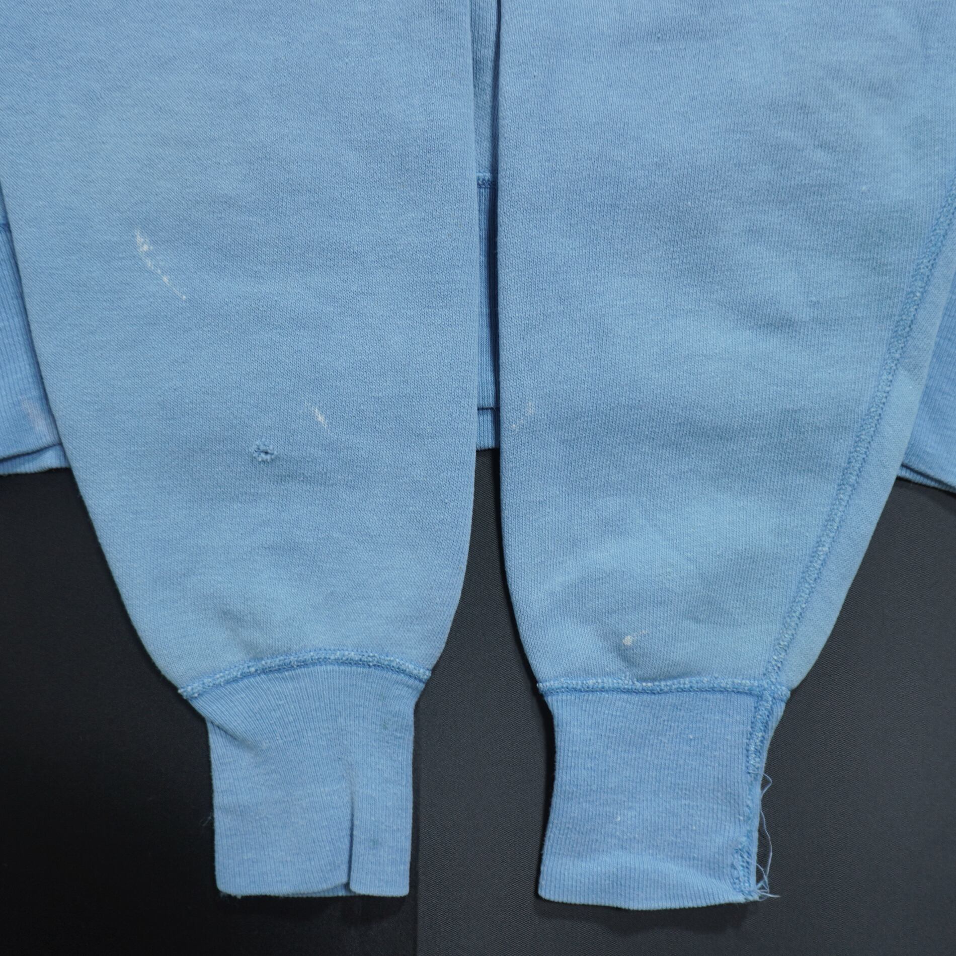 各所に汚れがあり、右袖と裾のリブに小穴、袖リブにリペア跡があります。